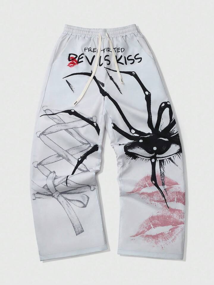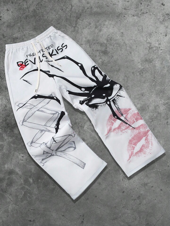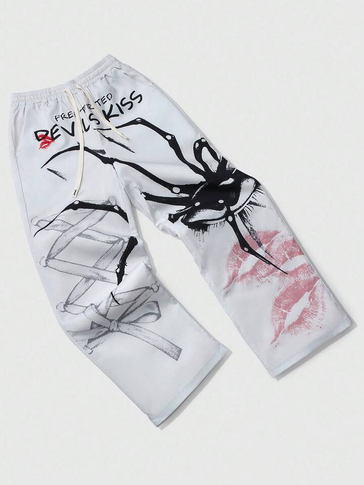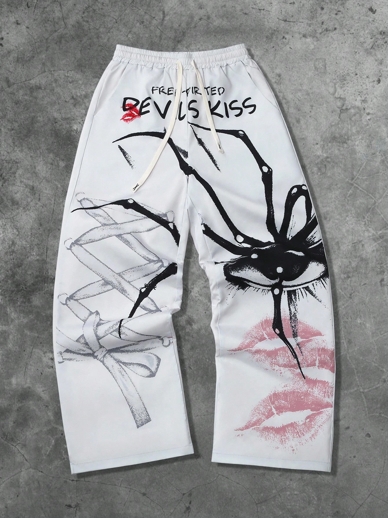 Street Life Pantaloni casual da uomo, stile di strada, con stampa a labbra rosse, vita con coulisse, gamba ampia e morbida, autunnali