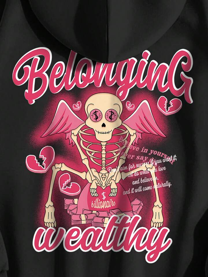 Street Life Uomo Felpa termica con cappuccio slogan & con stampa scheletri con tasca a marsupio con coulisse