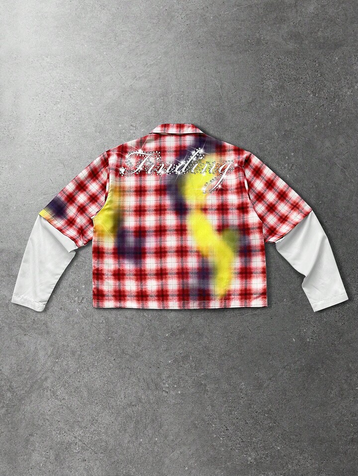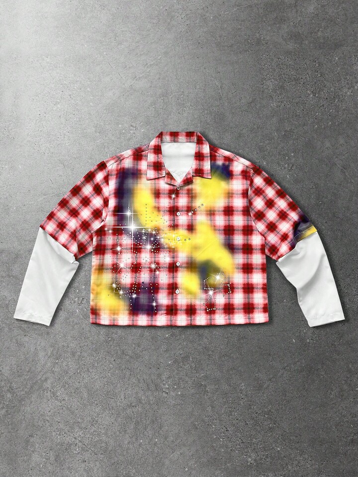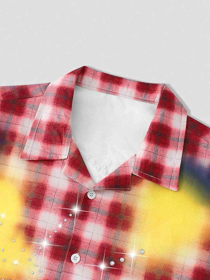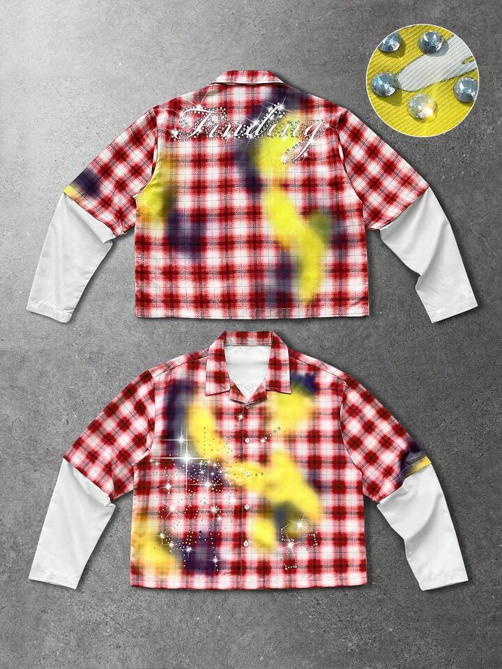 Street Life Camicia da uomo autunnale alla moda con patchwork a quadri e decorazioni in strass