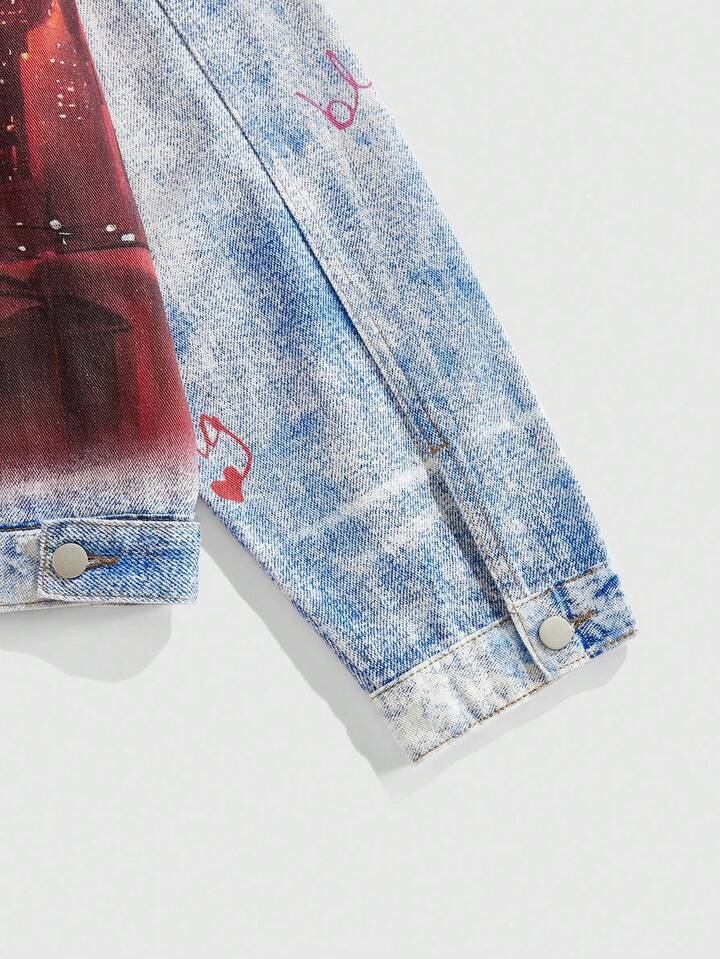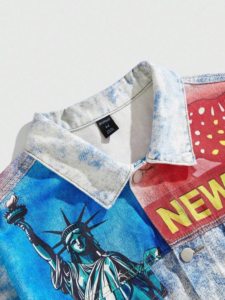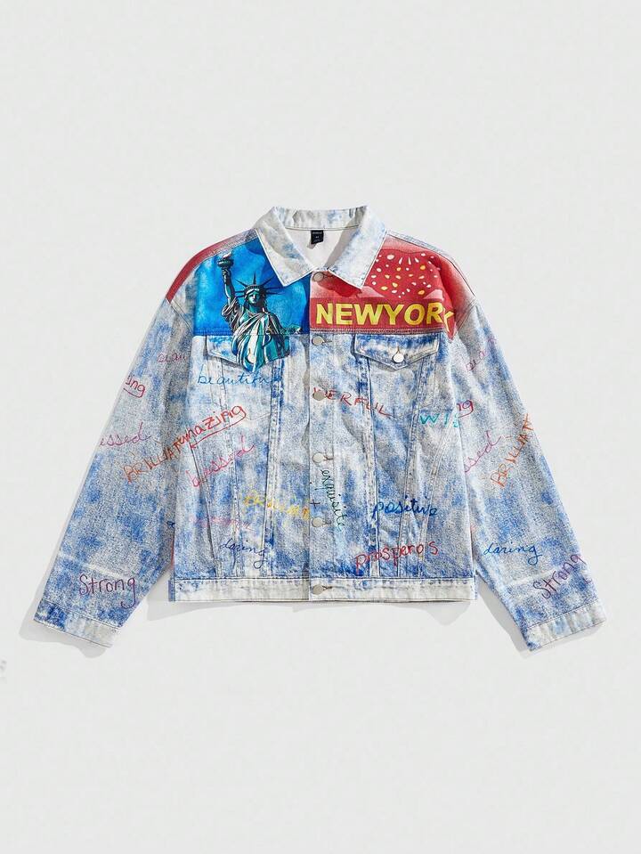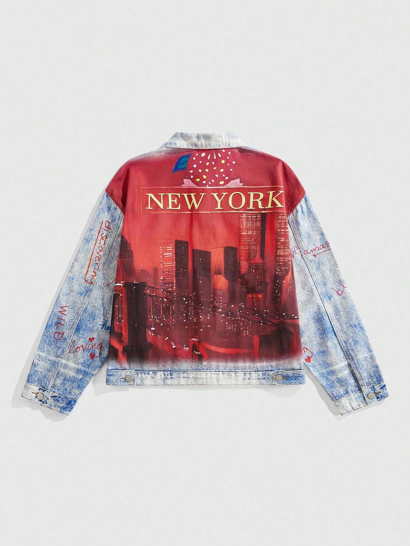 Street Life Giacca di jeans casual monopetto a maniche lunghe con stampa di lettere e architettura, da uomo, per l'autunno