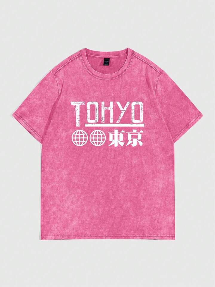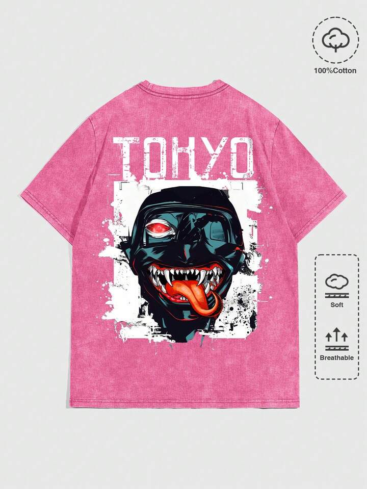 Street Life T-shirt a maniche corte da uomo con stampa a cartone animato in stile giapponese e lavaggio acido