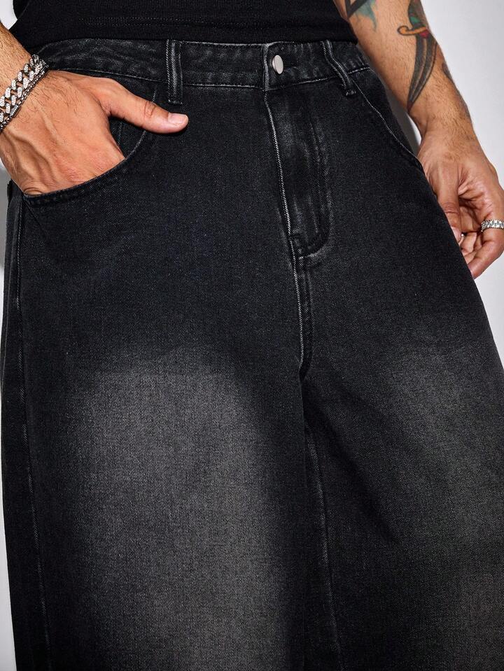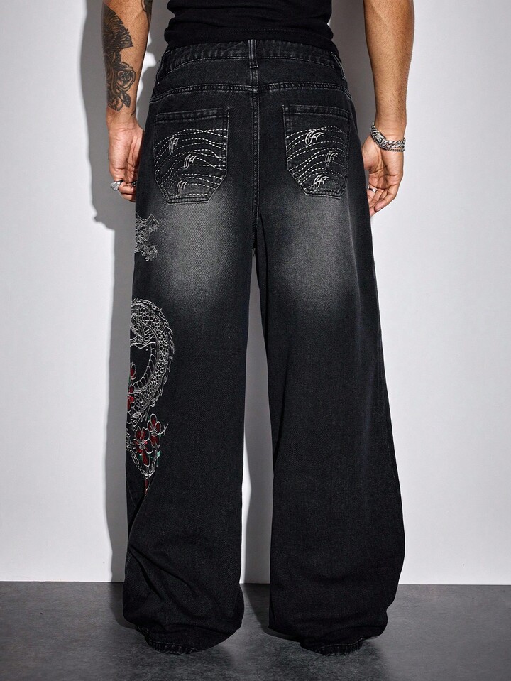 Street Life Jeans casual da uomo, stile di strada, con ricamo di drago cinese e motivo floreale, lavati, ampi e con gamba larga