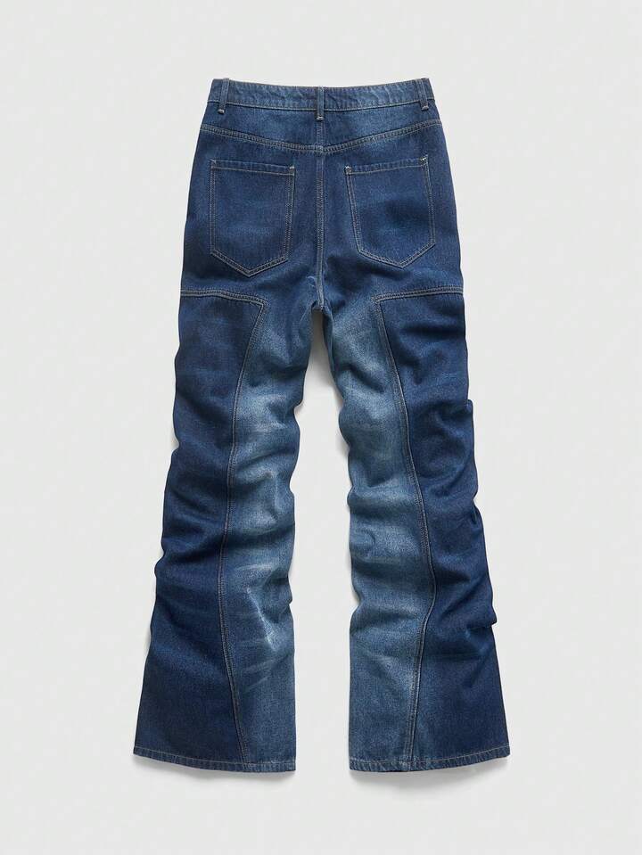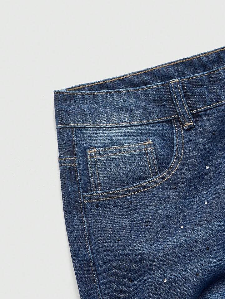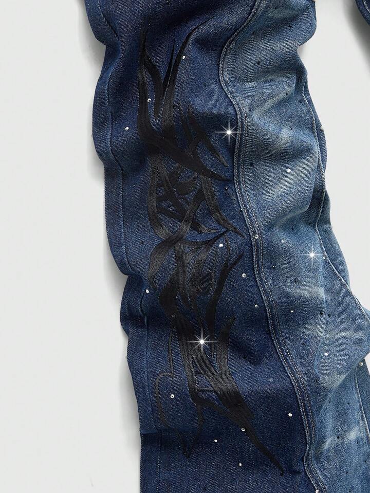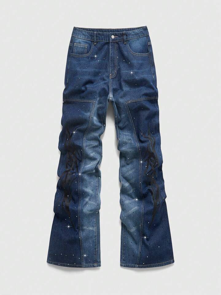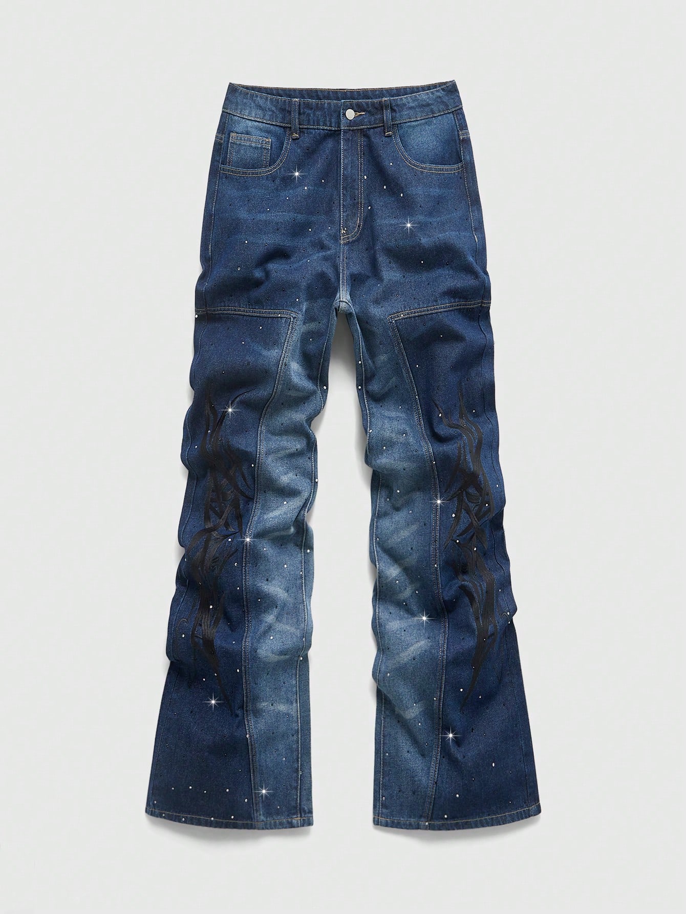 Street Life Jeans casual da uomo alla moda con ricamo di strass e lavaggio sfumato a campana