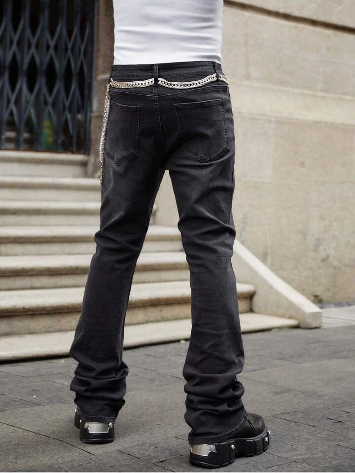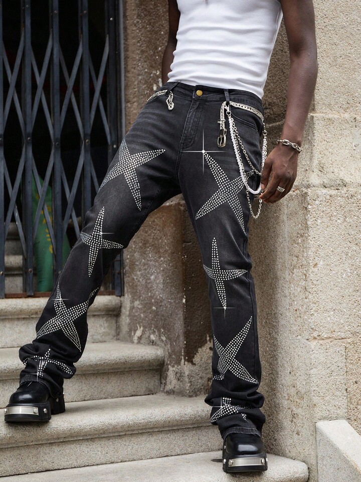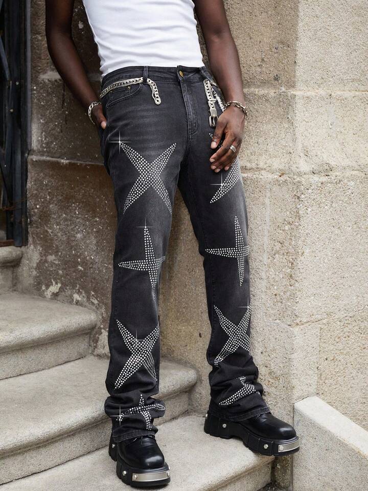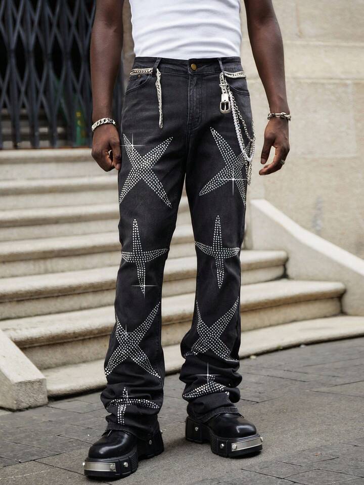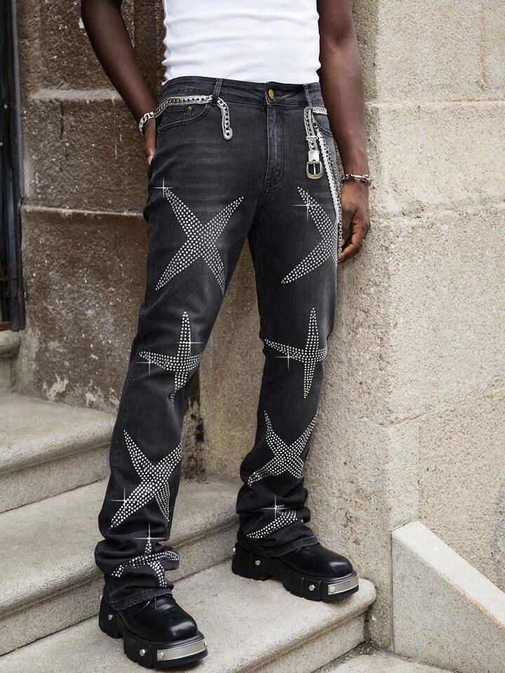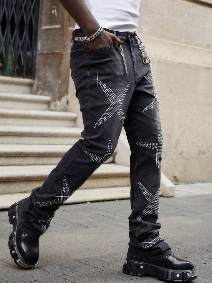 Street Life Jeans casual da uomo con tasche e design con strass, stile grunge