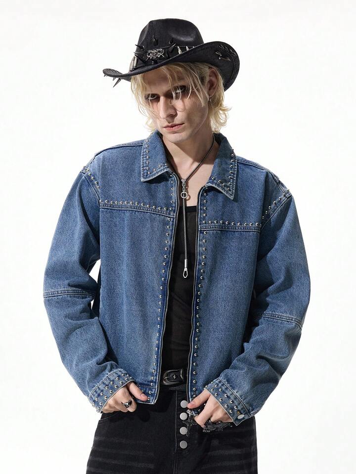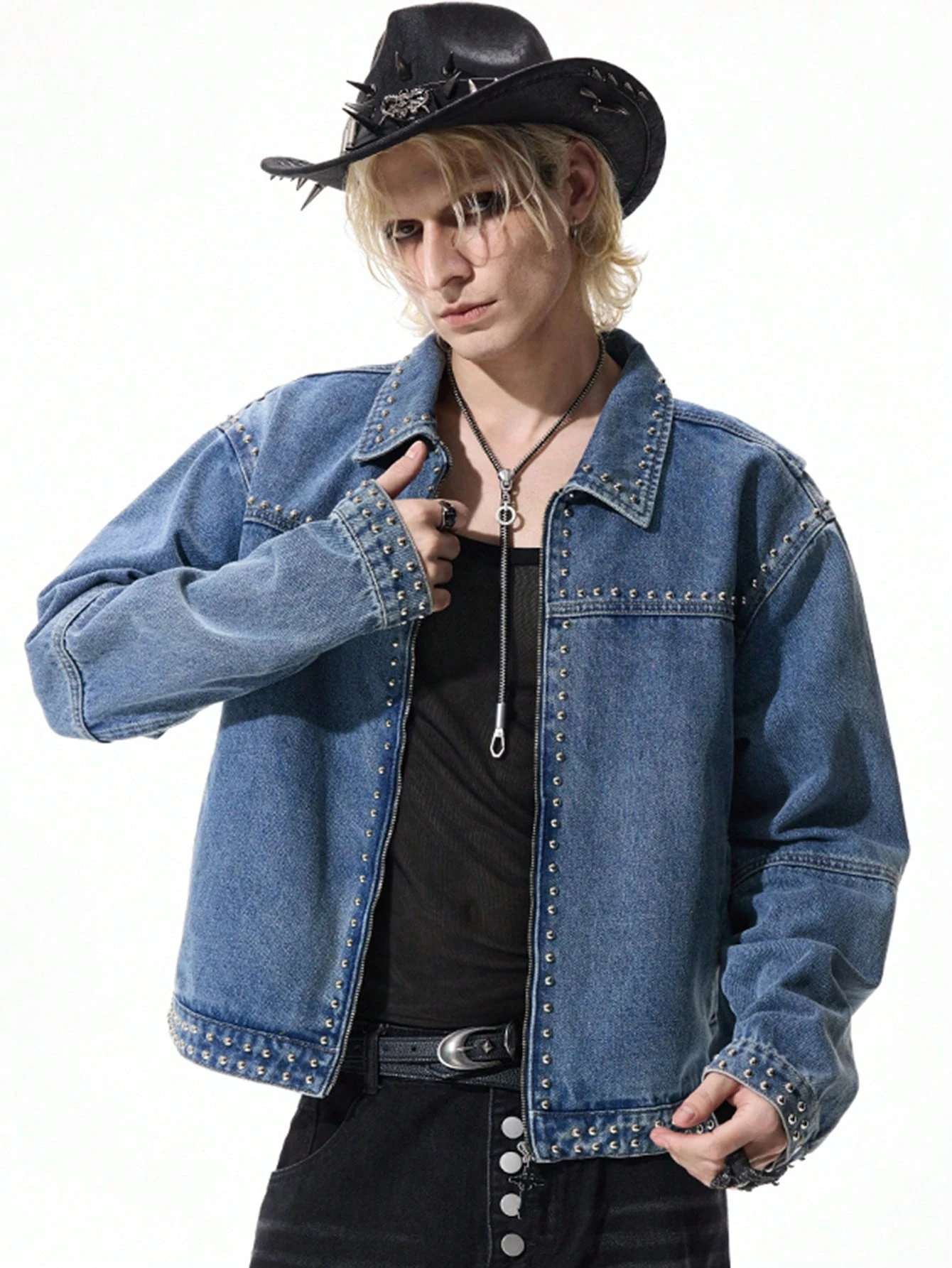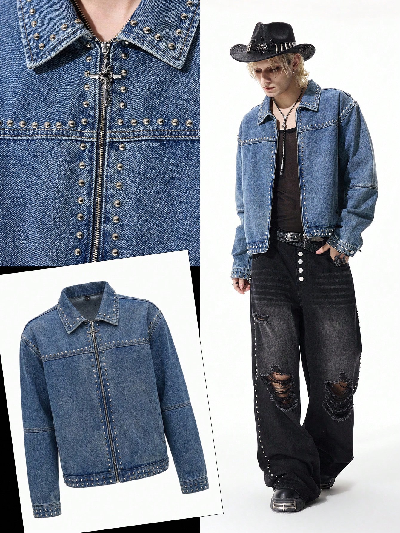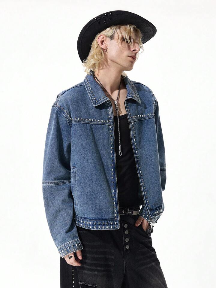 Street Life Giacca di jeans casual da uomo con cerniera frontale e rivetti, spalle a caduta