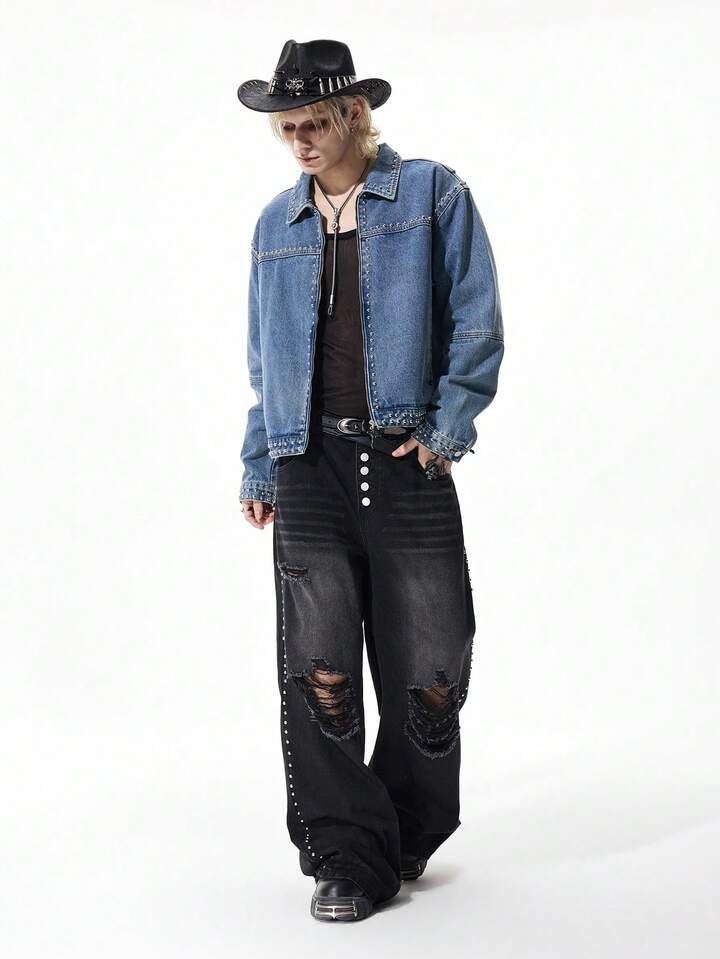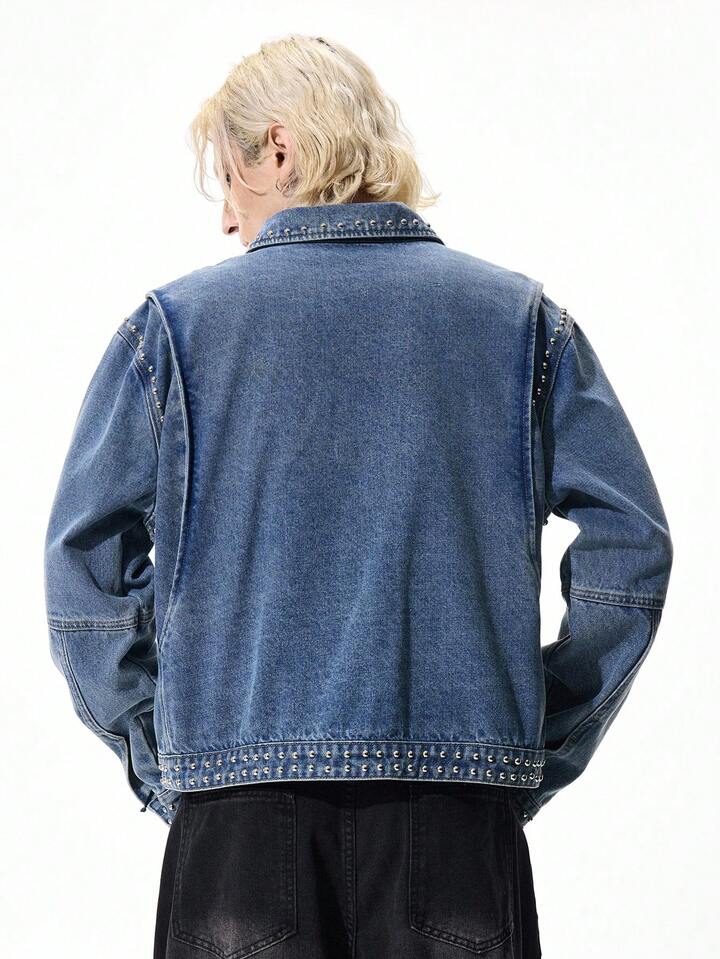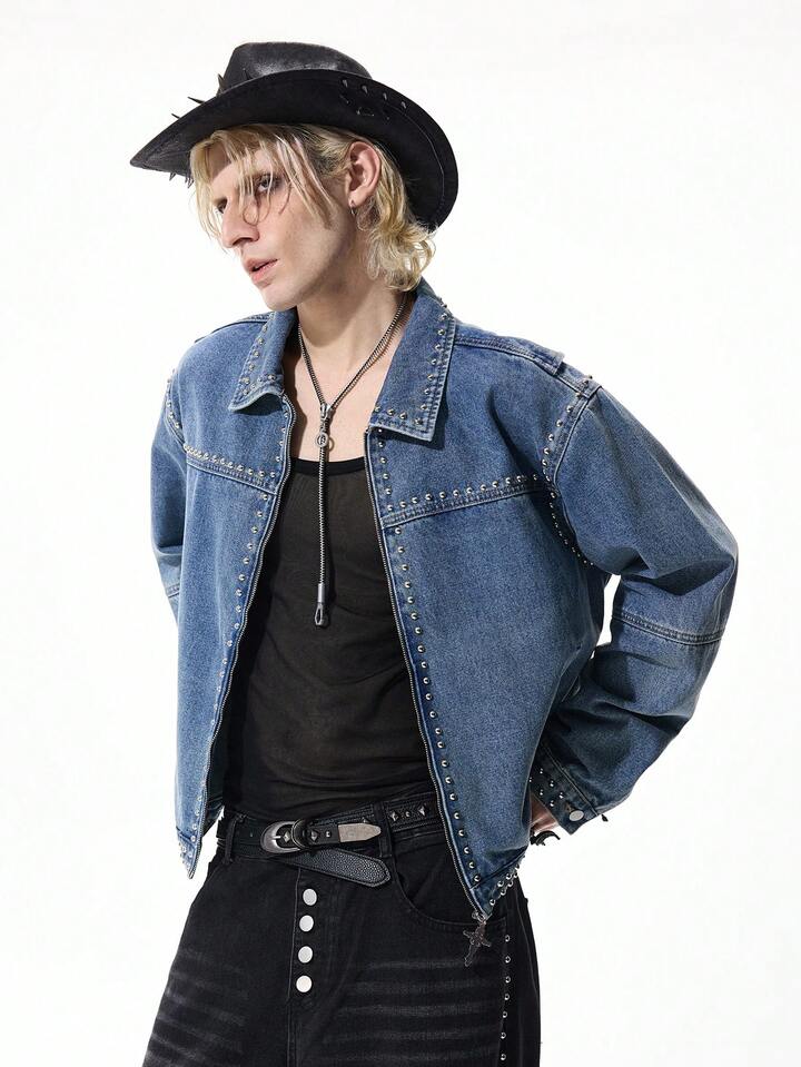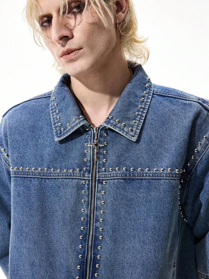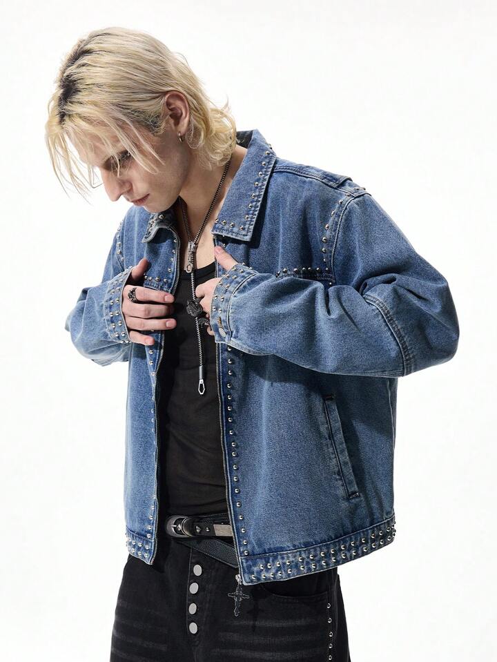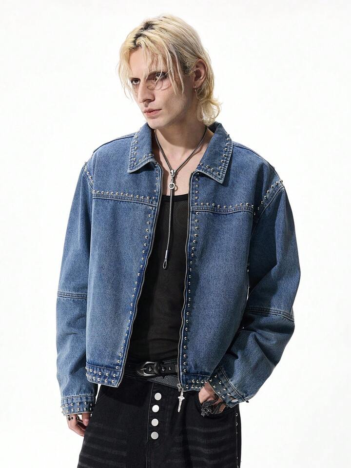 Street Life Giacca di jeans casual da uomo con cerniera frontale e rivetti, spalle a caduta