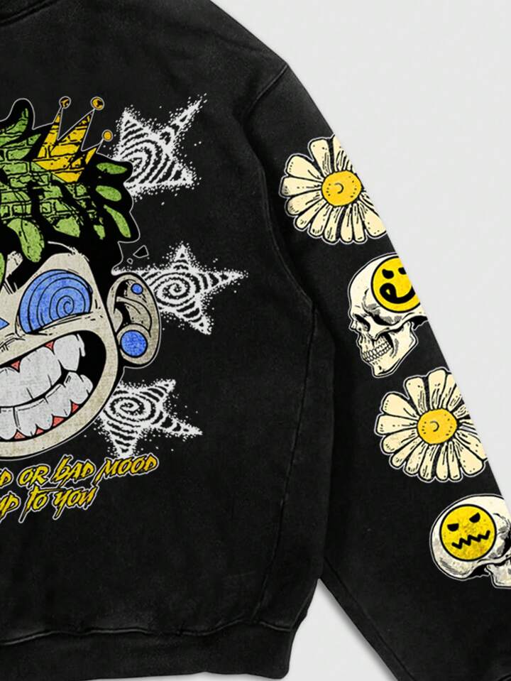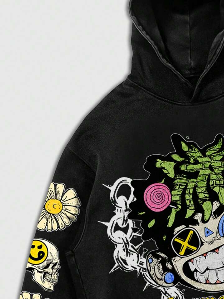 Street Life Felpa con cappuccio a maniche lunghe con stampe di slogan e cartoni animati casual da uomo, autunno e inverno