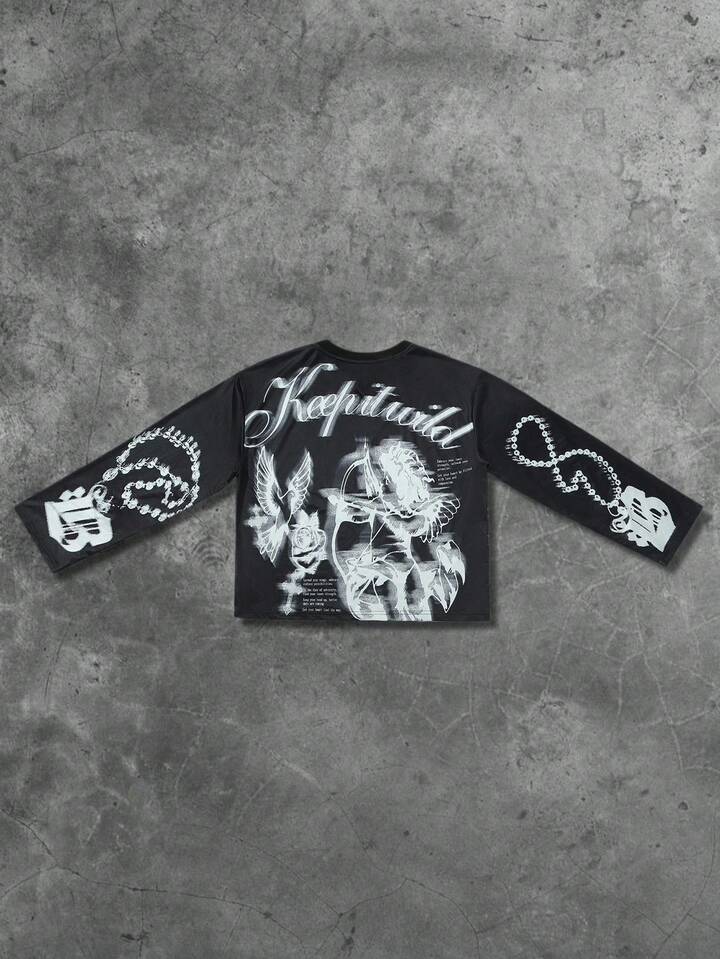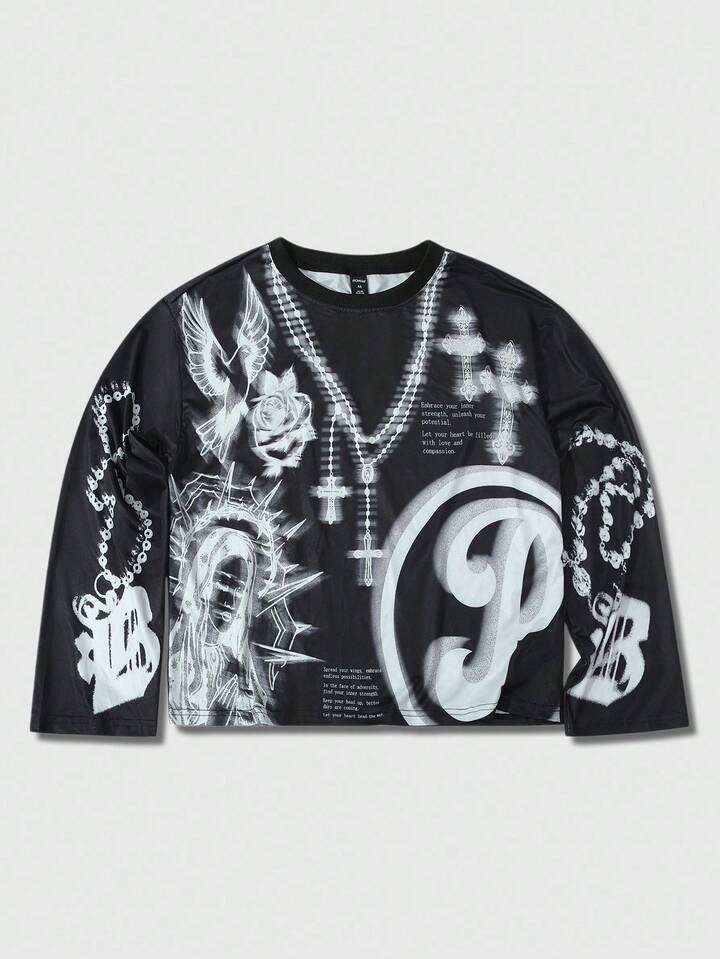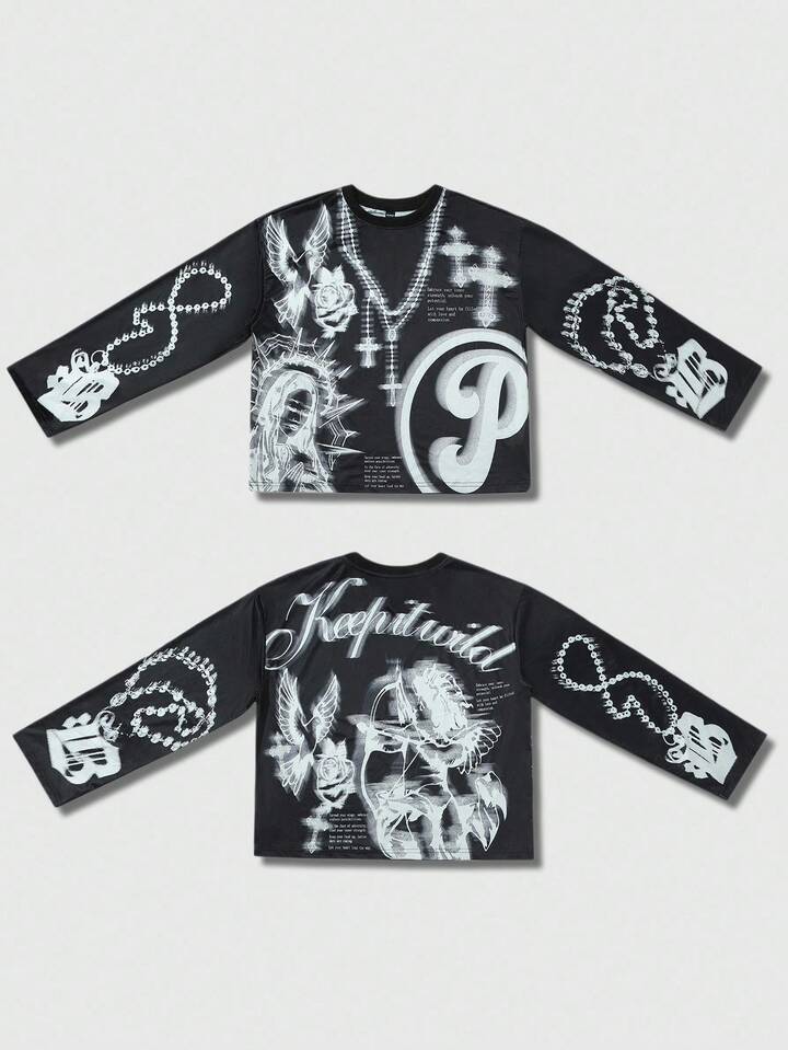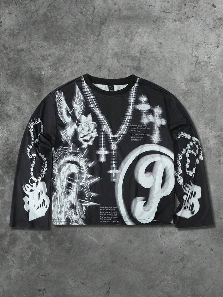 Street Life Maglietta a maniche lunghe casual da uomo con stampa di lettere e croci, autunnale
