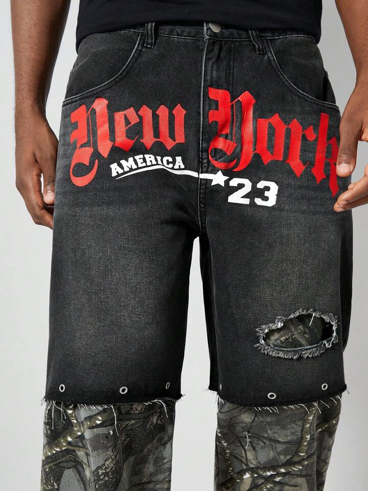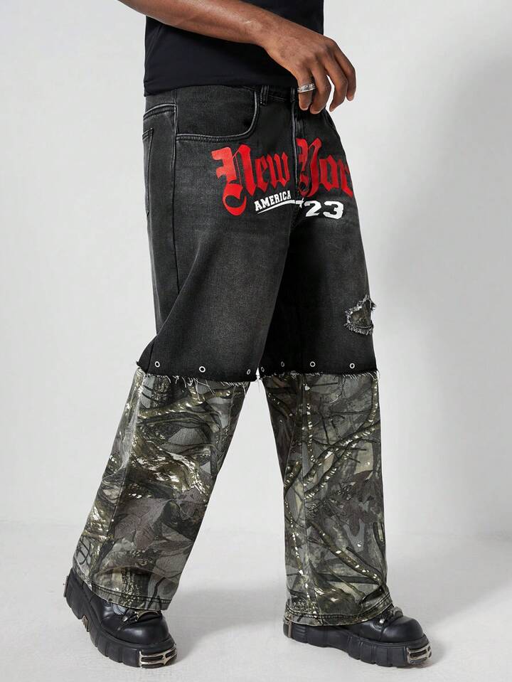 Street Life Jeans casual da uomo, stile streetwear, stampa con lettera e albero, orlo grezzo, linea dritta, 2 in 1