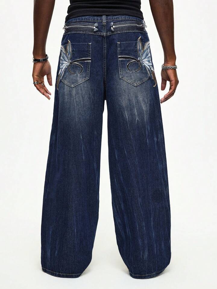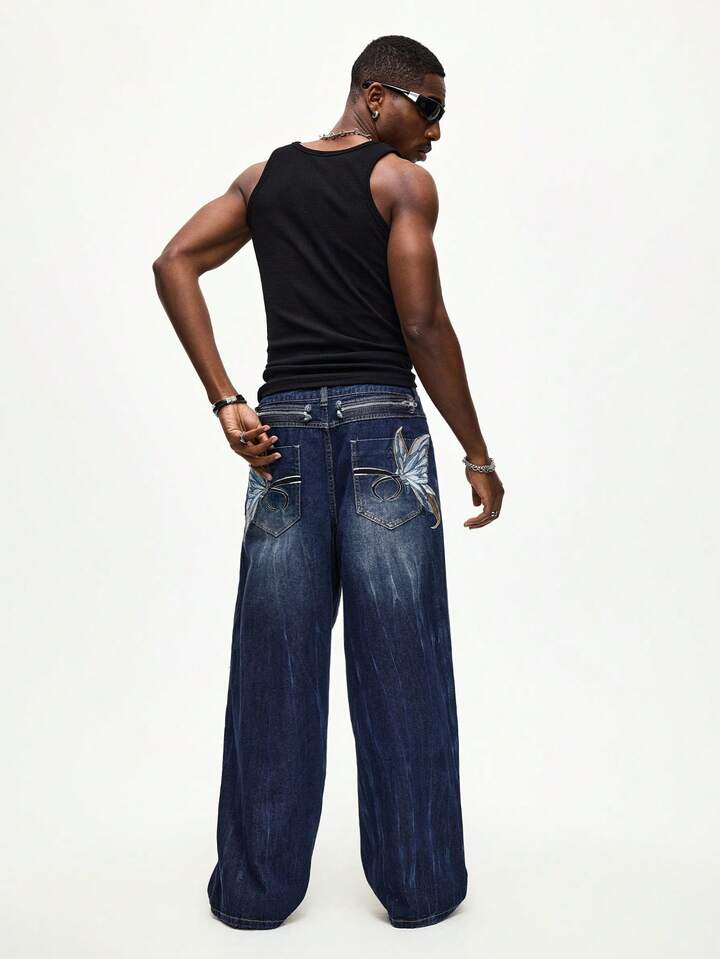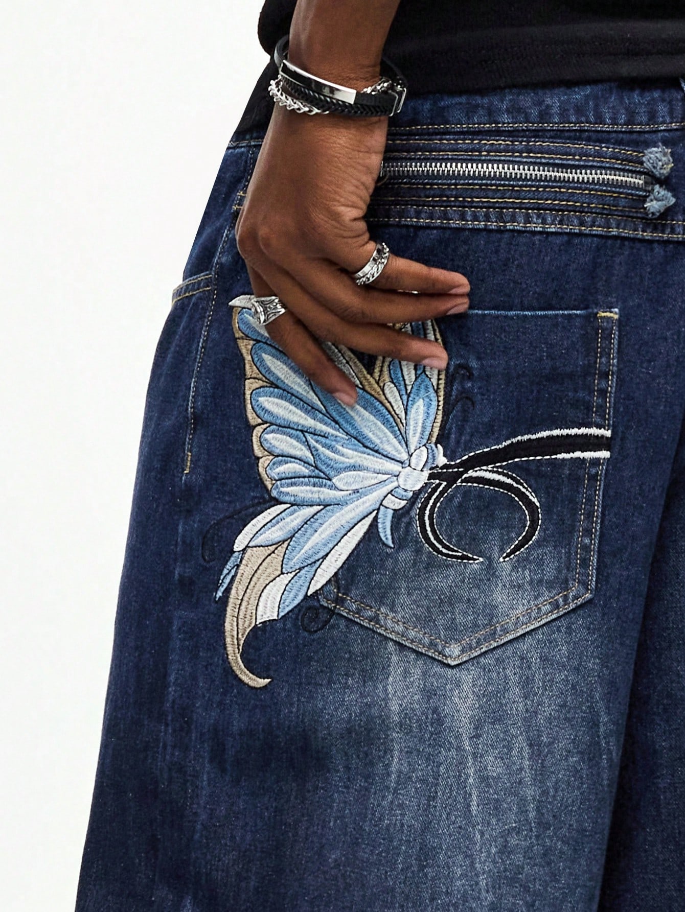 Street Life Jeans casual da uomo in denim lavato con ricamo a farfalla