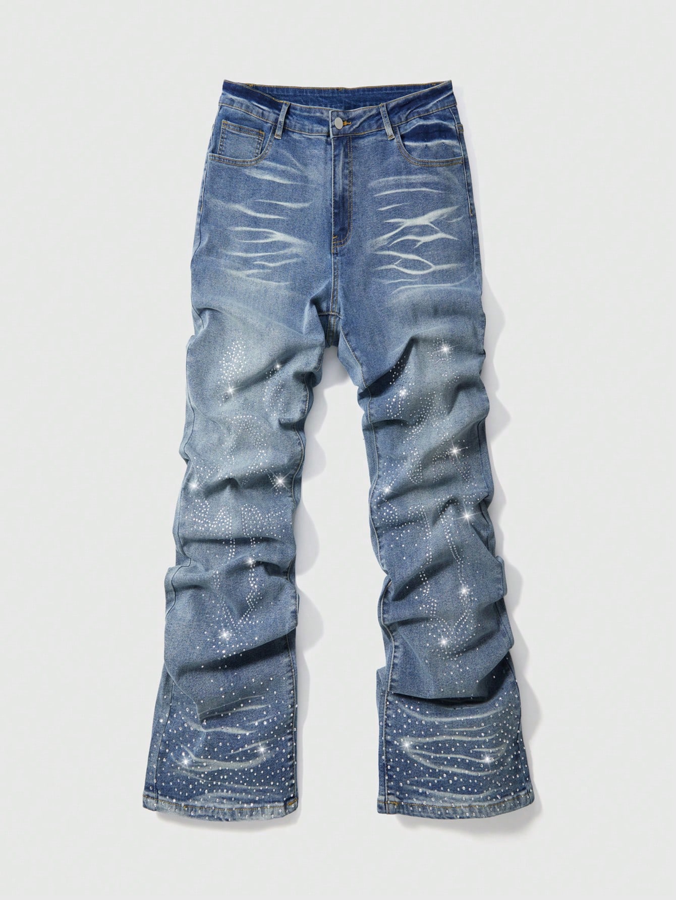 Street Life Jeans casual da uomo con lavaggio e applicazioni di strass, a zampa d'elefante
