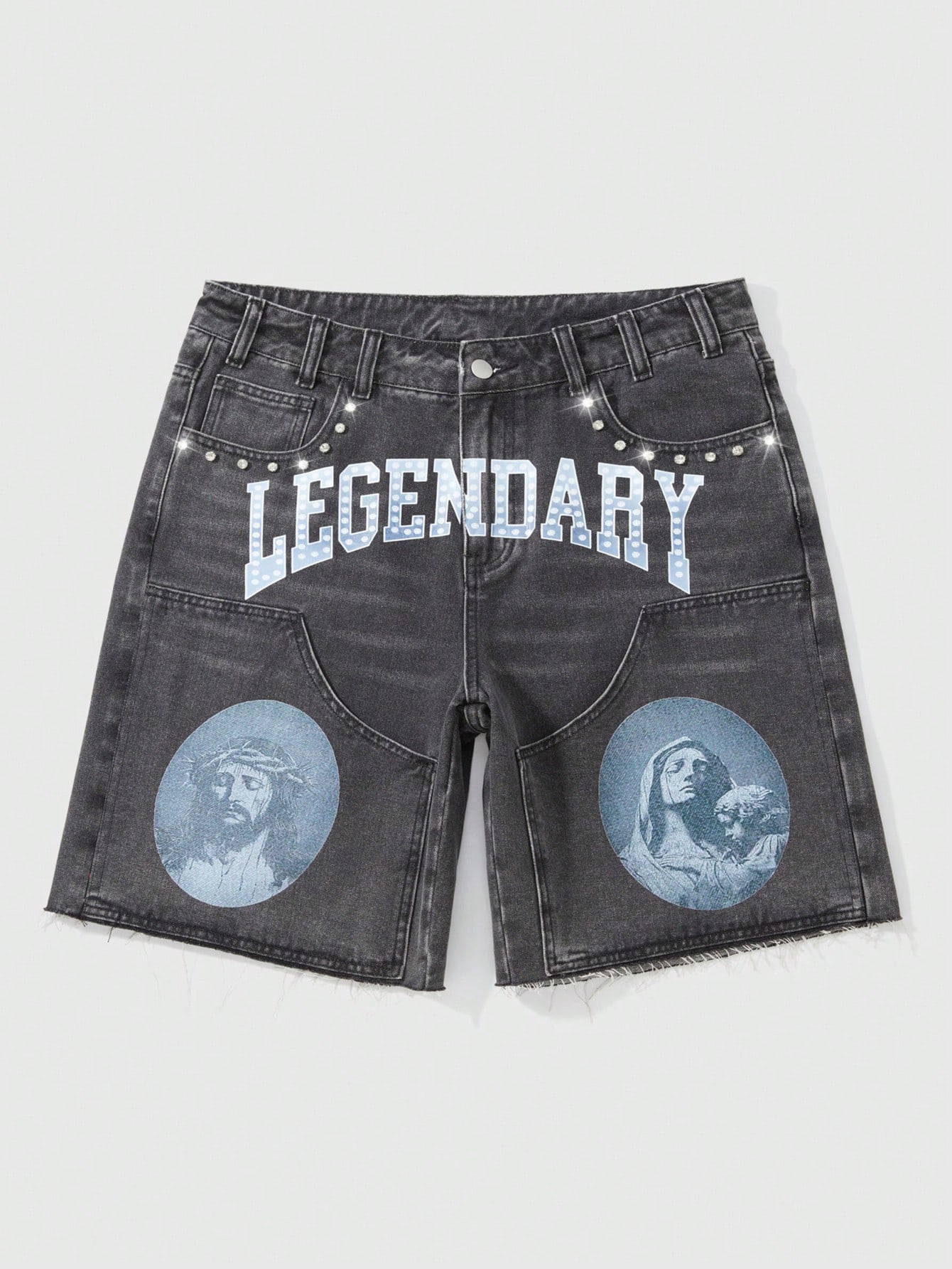 Street Life Pantaloncini di jeans da uomo con stampa di figure e lettere, decorati con strass