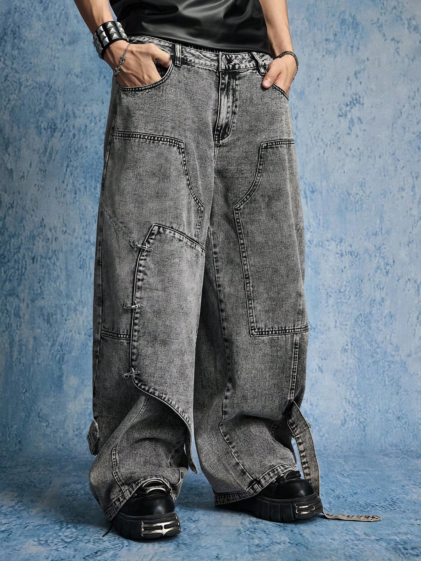 Street Life Jeans casual larghi con gamba ampia, con fibbia a forma di aereo e effetto vissuto, per uomo