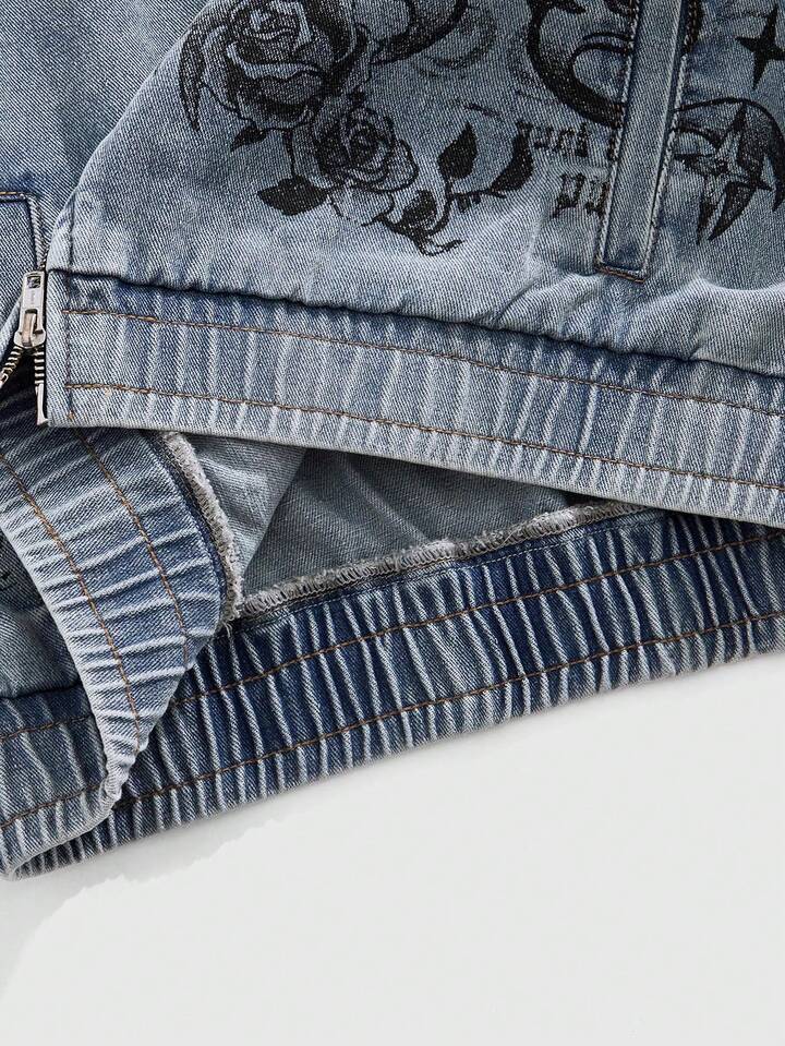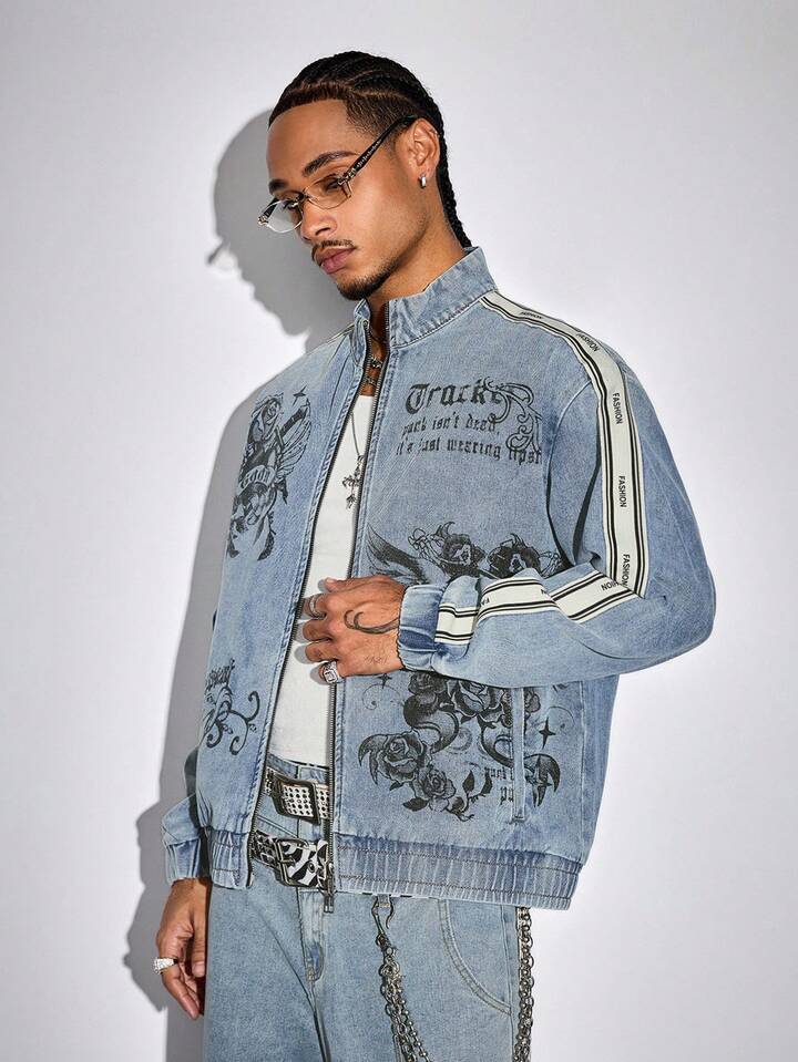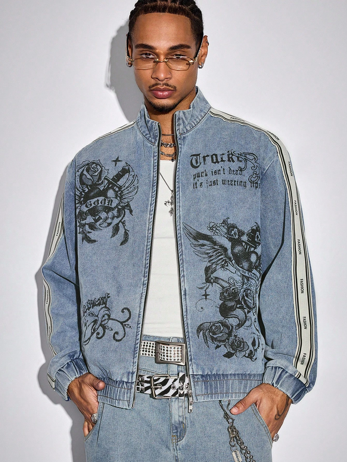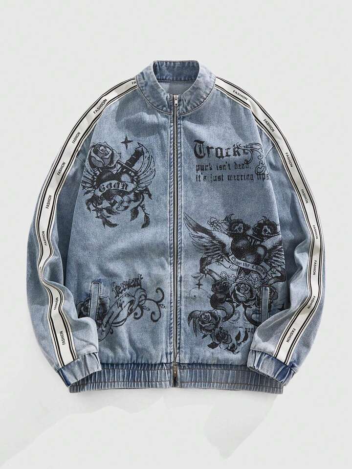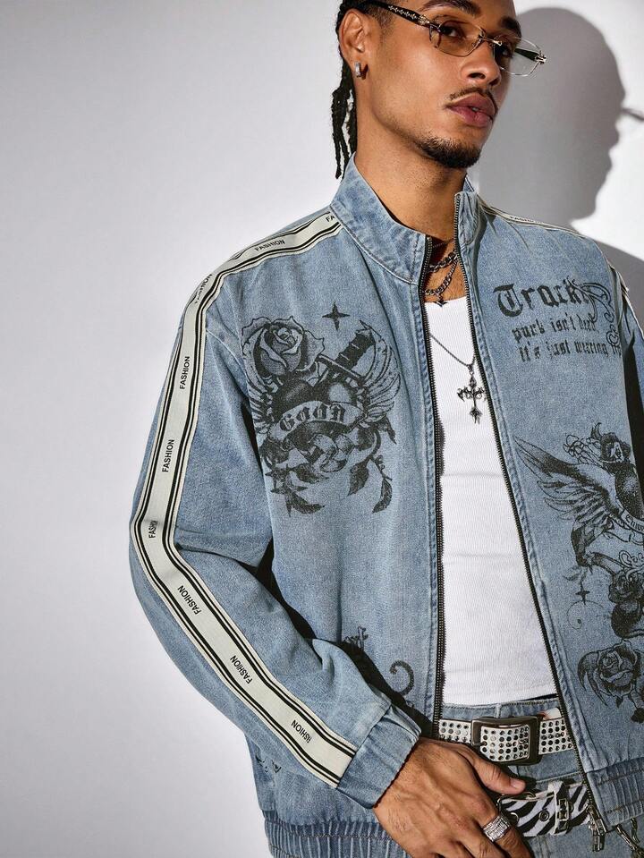 Street Life Giacca di jeans da uomo con grafica a rose, collo alto, chiusura lampo, design a contrasto e spalle cadenti, versatile e creativa