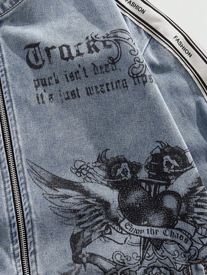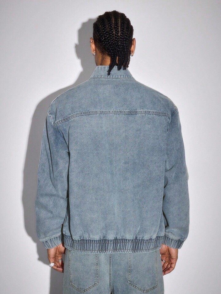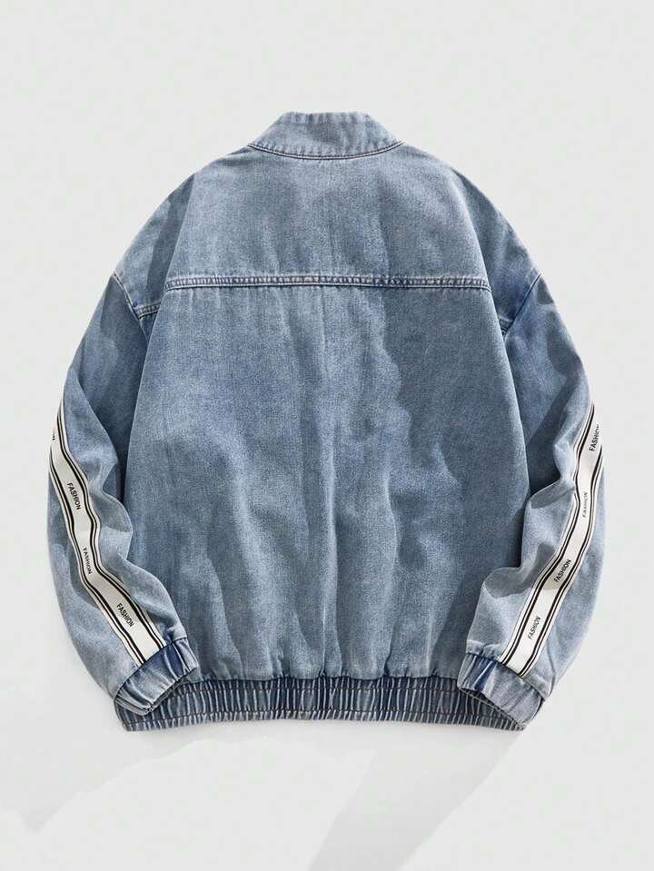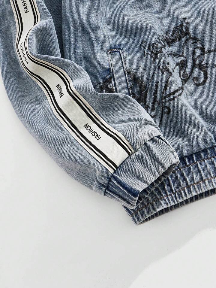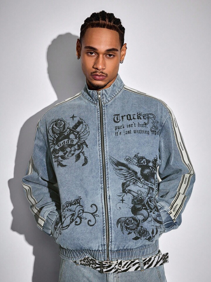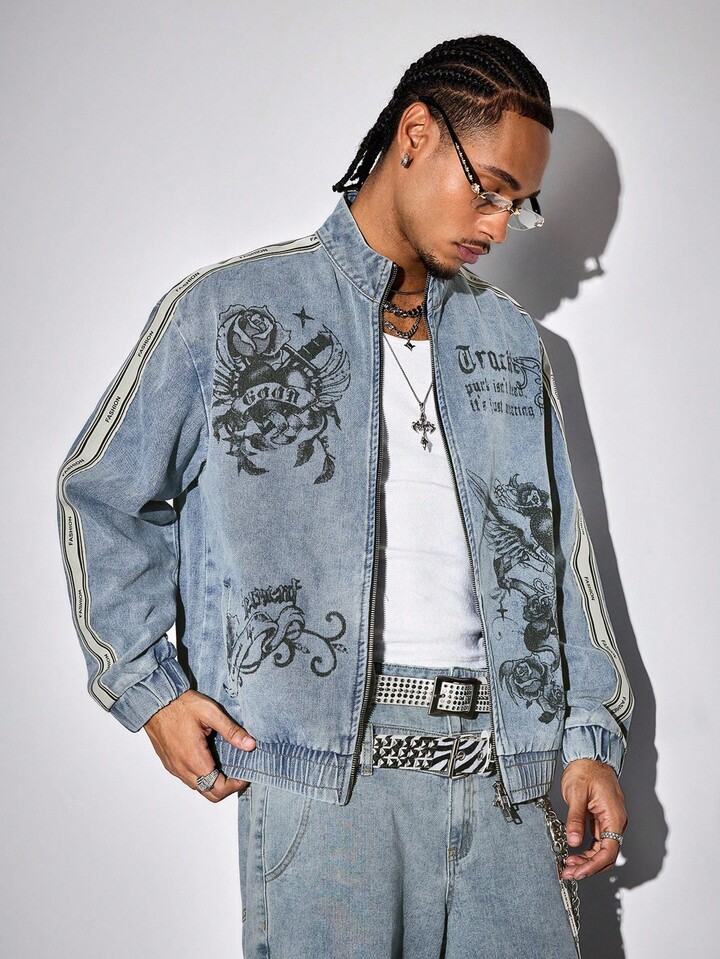 Street Life Giacca di jeans da uomo con grafica a rose, collo alto, chiusura lampo, design a contrasto e spalle cadenti, versatile e creativa