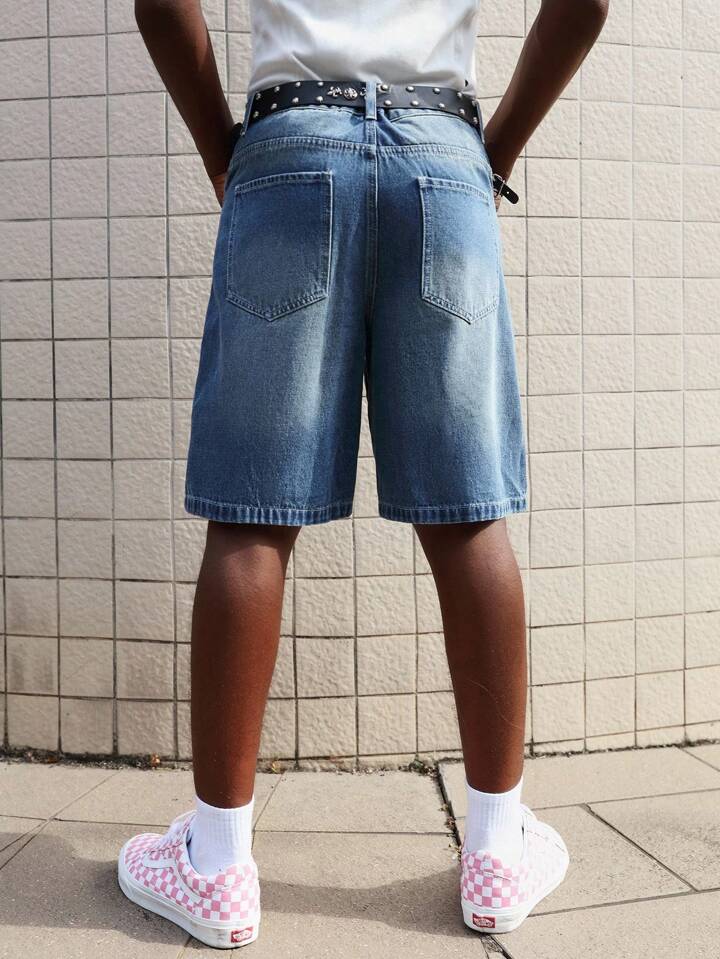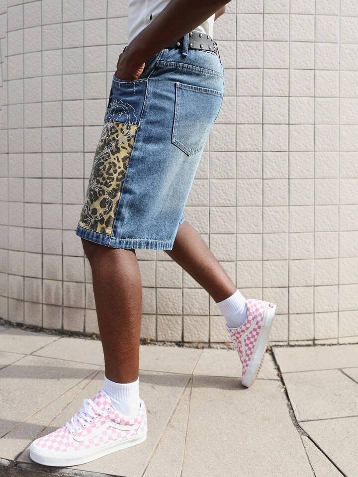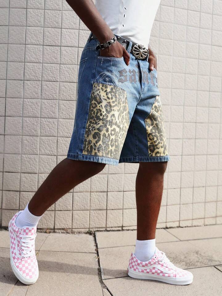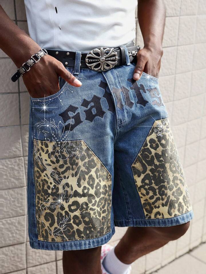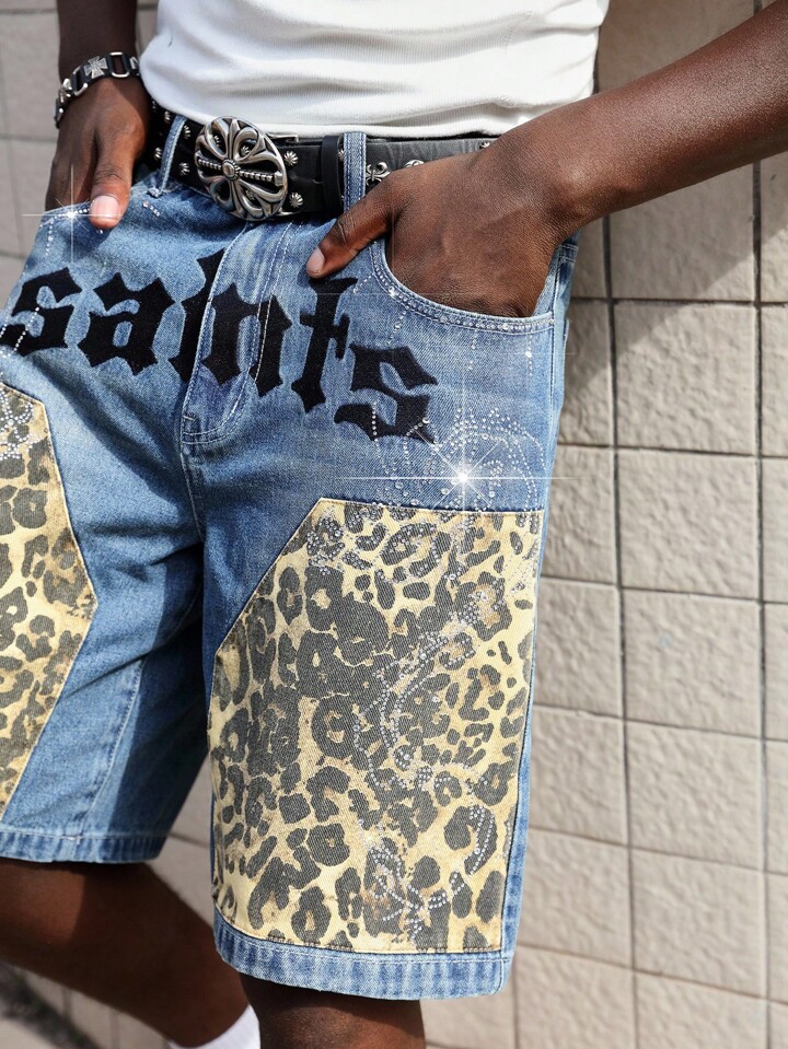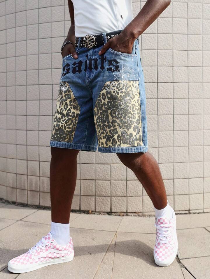 Street Life Bermuda di jeans da uomo alla moda con stampe leopardate e lettere, tasche