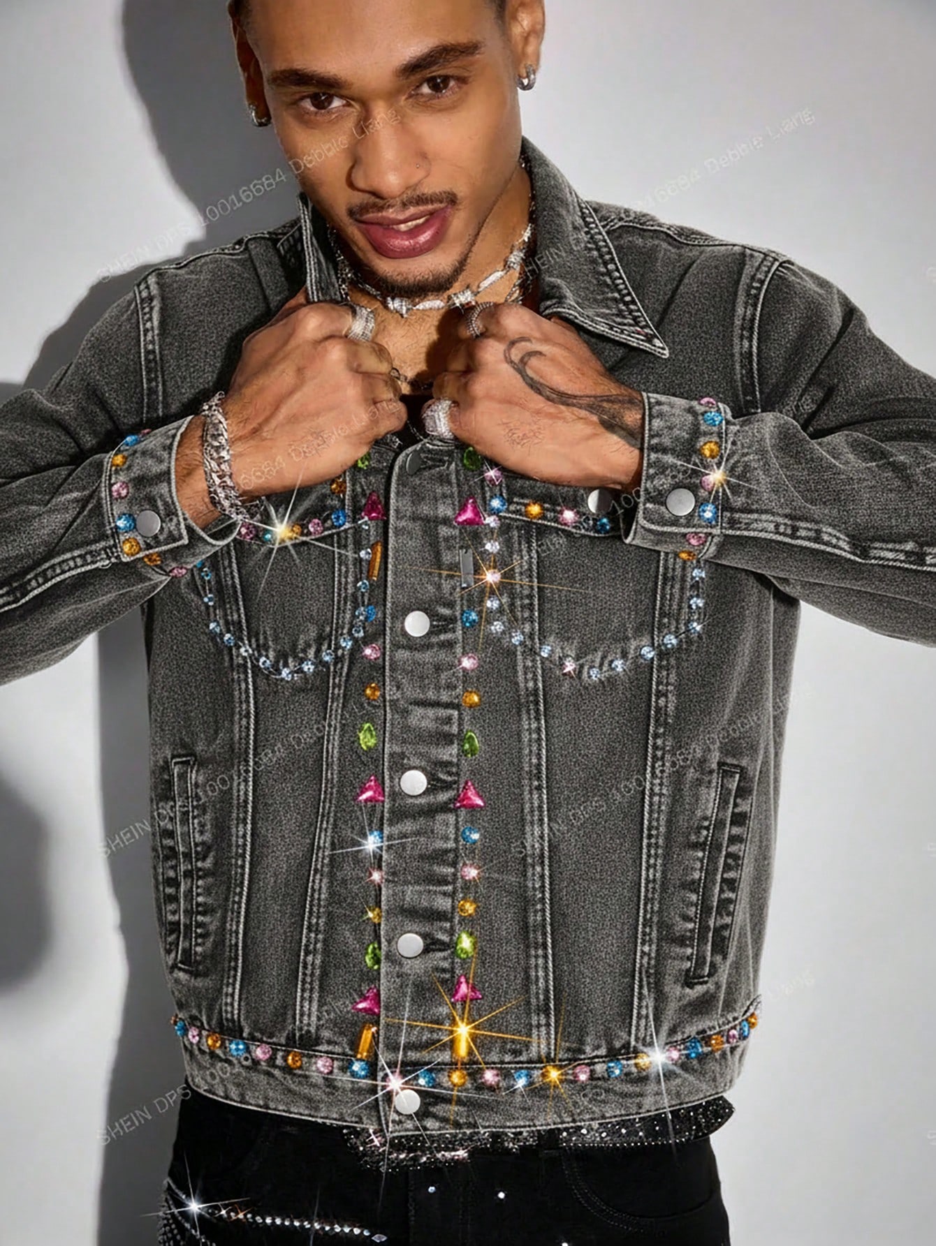 Street Life Giacca di jeans da uomo alla moda, lavata e consumata, con strass