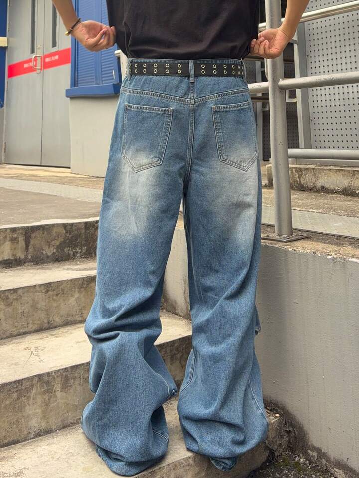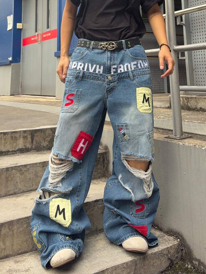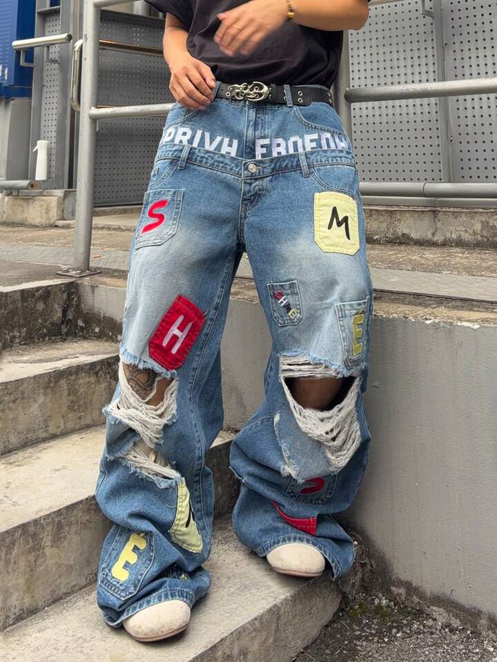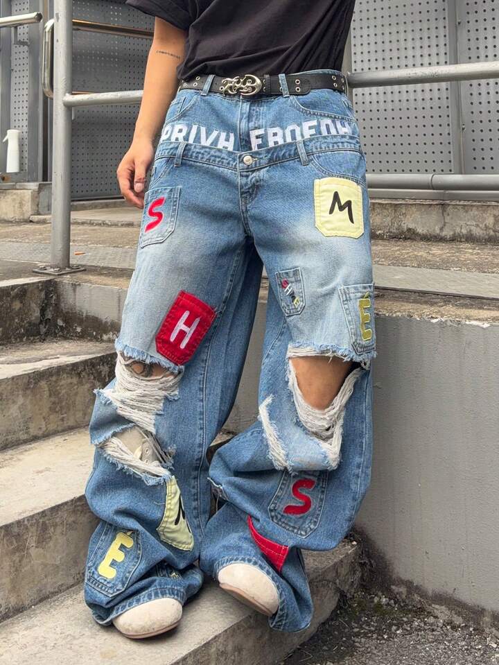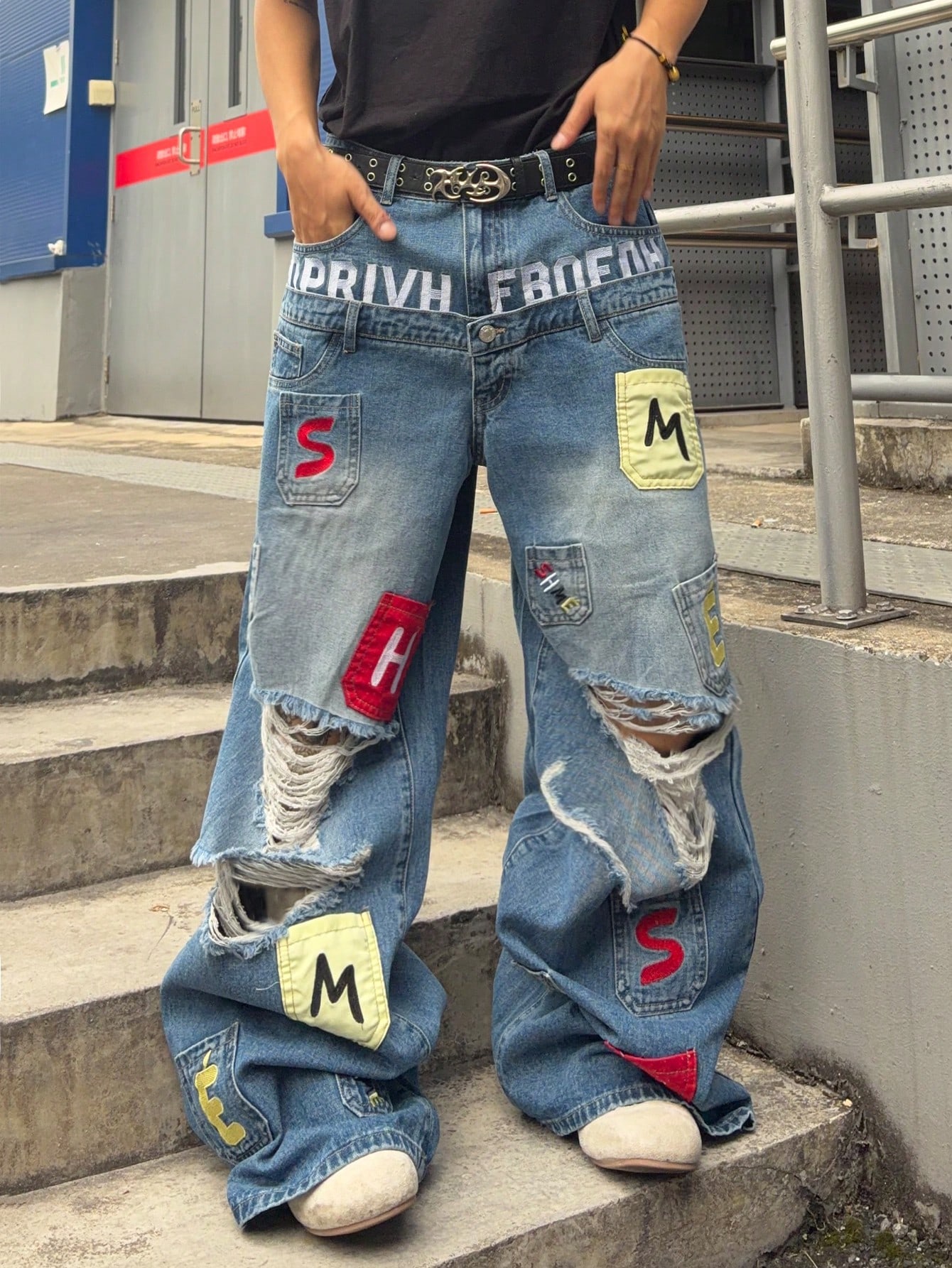 Street Life Jeans casual alla moda da uomo, con gamba ampia, effetto vissuto e ricamo a lettera