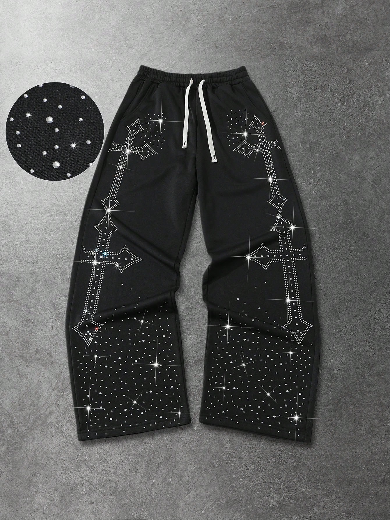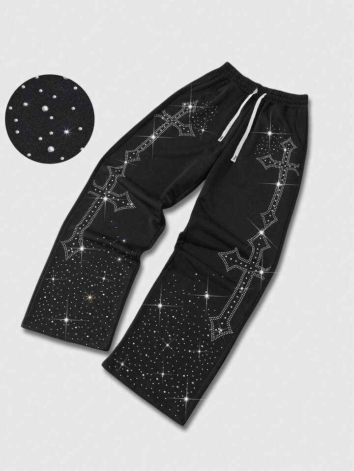 Street Life Pantaloni della tuta casual alla moda da uomo con cordoncino e decorazioni in strass