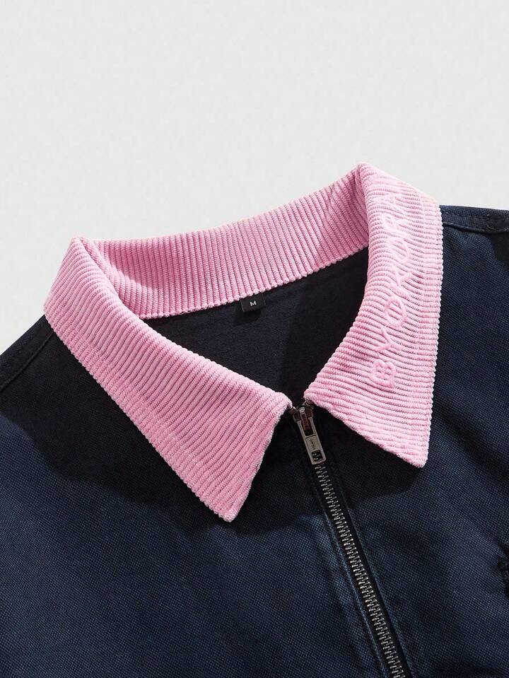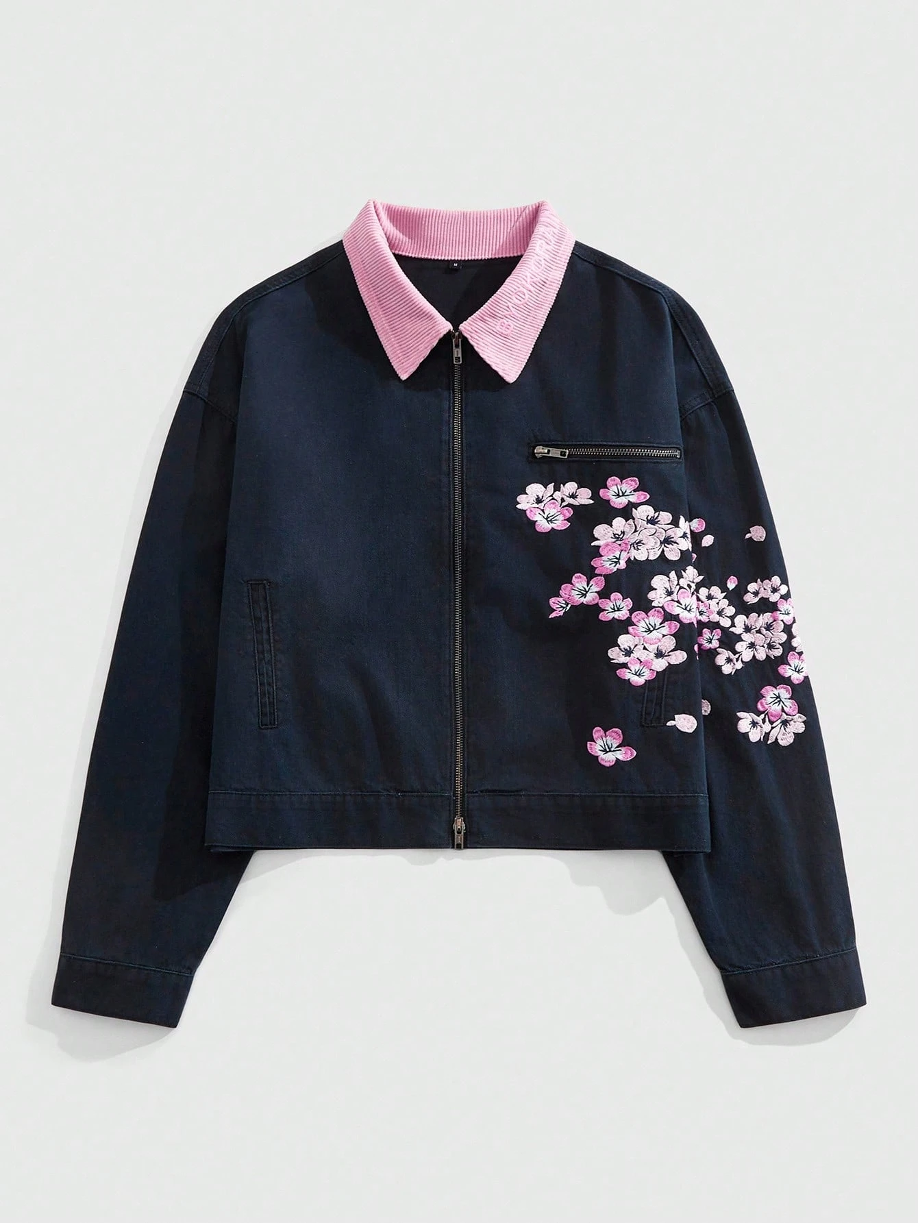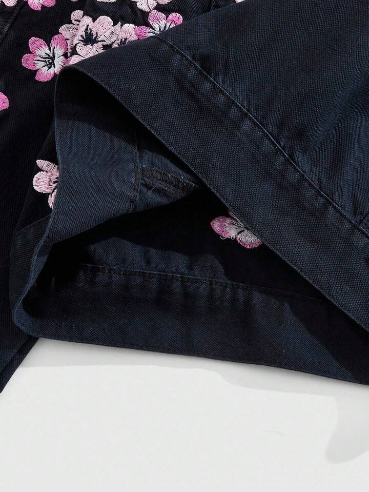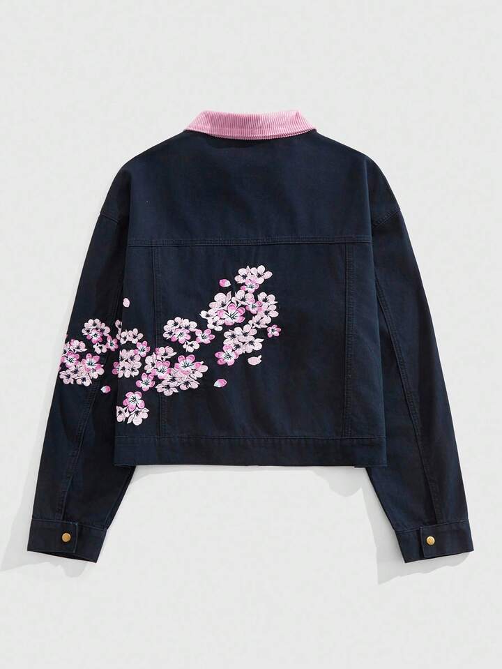 Street Life Giacca di jeans da uomo con chiusura lampo e colletto con ricamo floreale alla moda