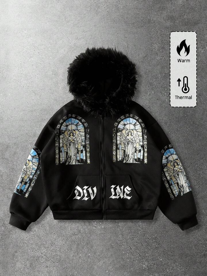 Street Life Felpa con cappuccio e chiusura lampo uomo, con stampa di lettere, colletto in pile, vestibilità ampia