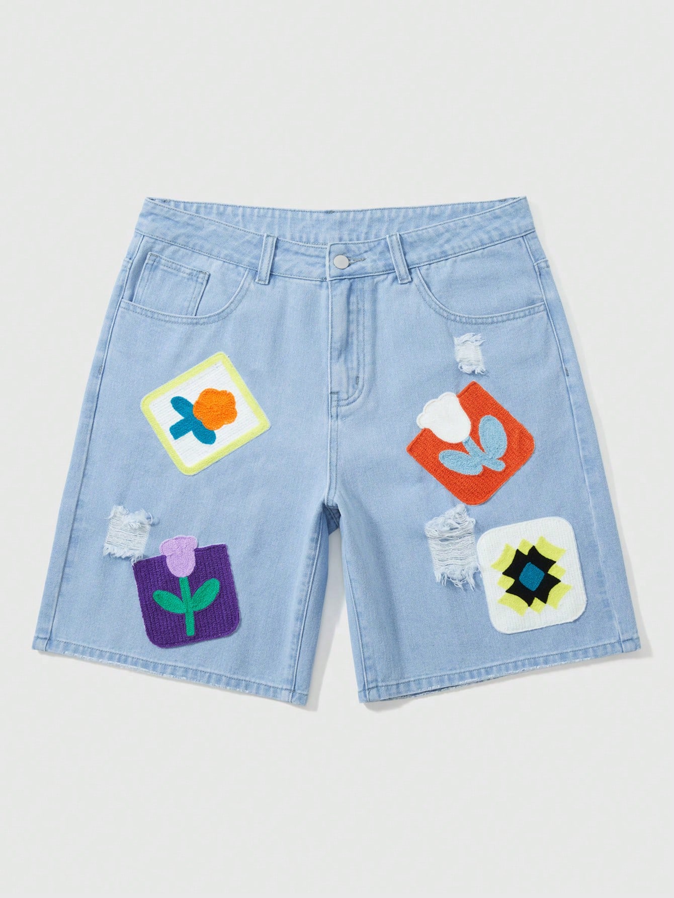 Street Life Pantaloncini di jeans casual da uomo con decori floreali e tasche consumati