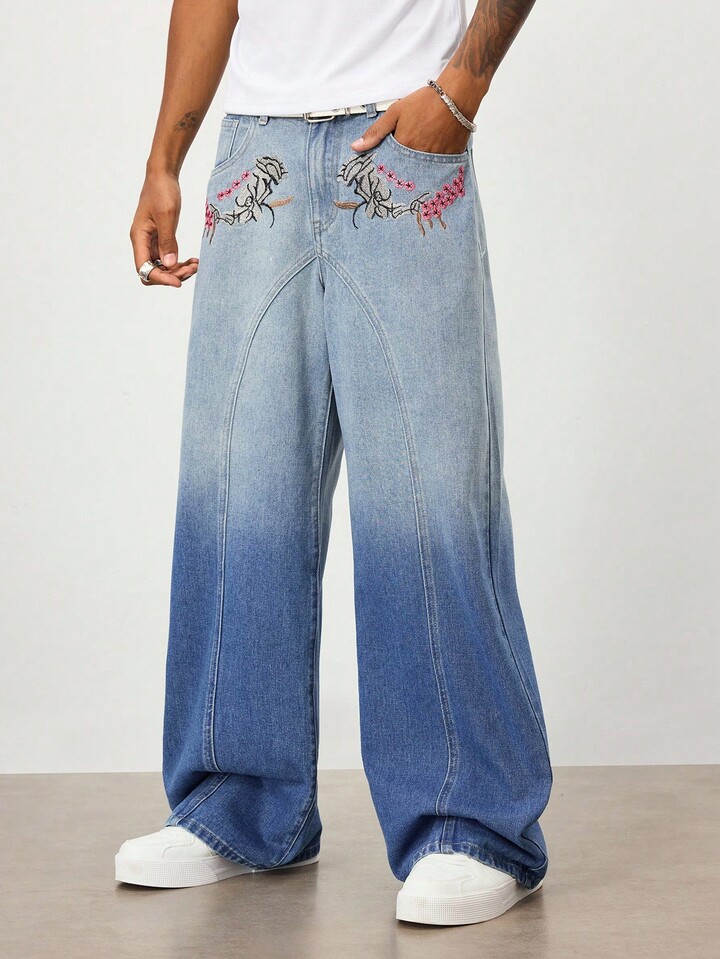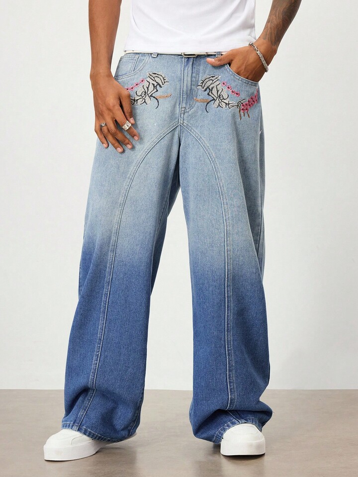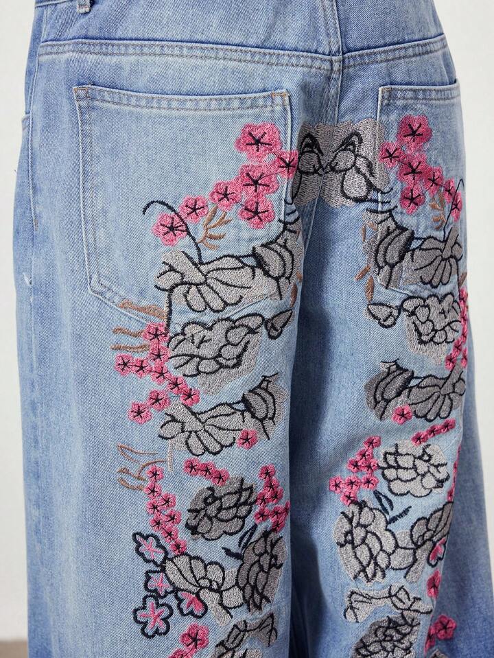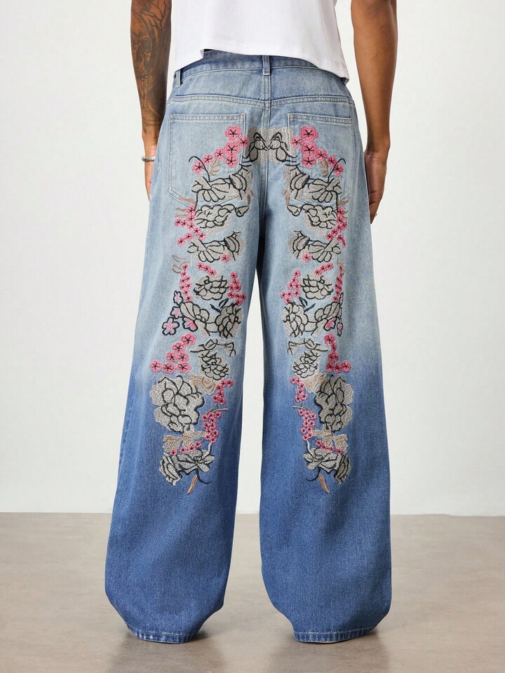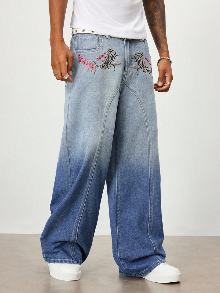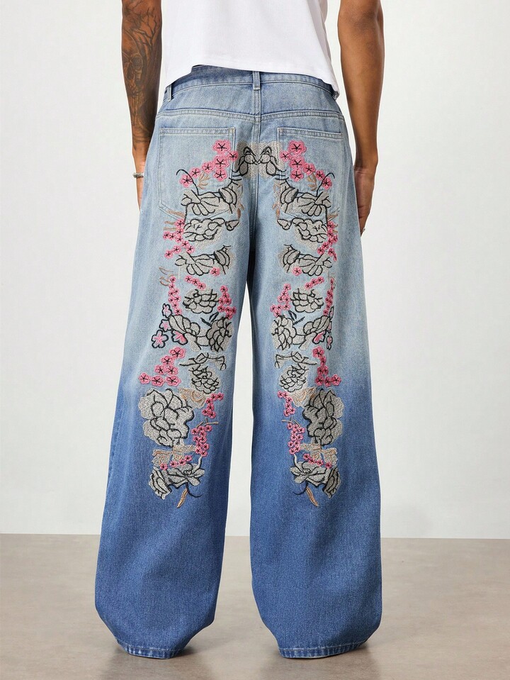 Street Life Jeans larghi e morbidi da uomo con ricamo floreale