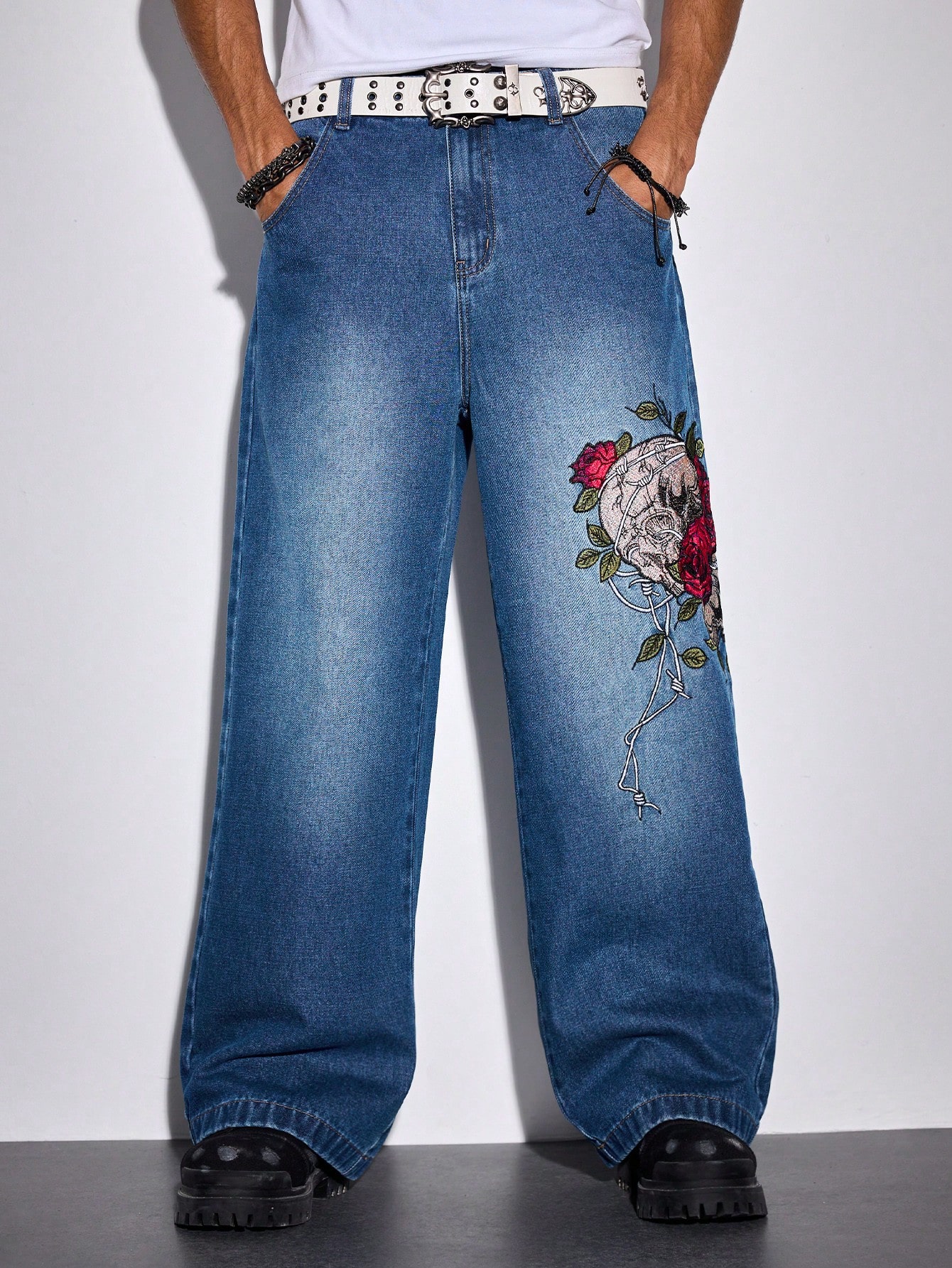 Street Life Jeans casual larghi con gamba ampia e ricamo floreale sulla tasca per uomo