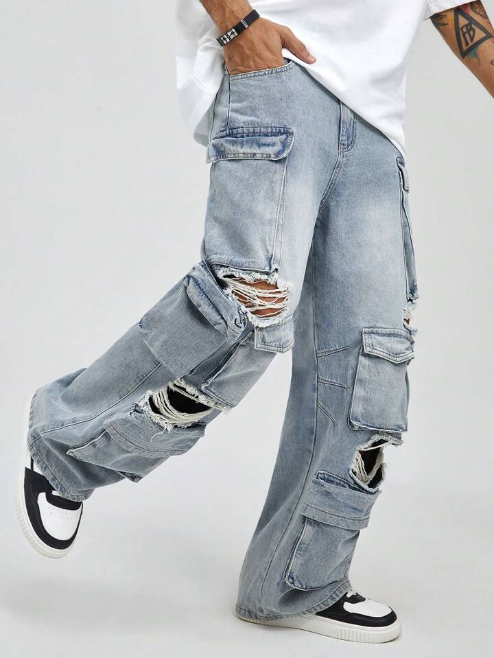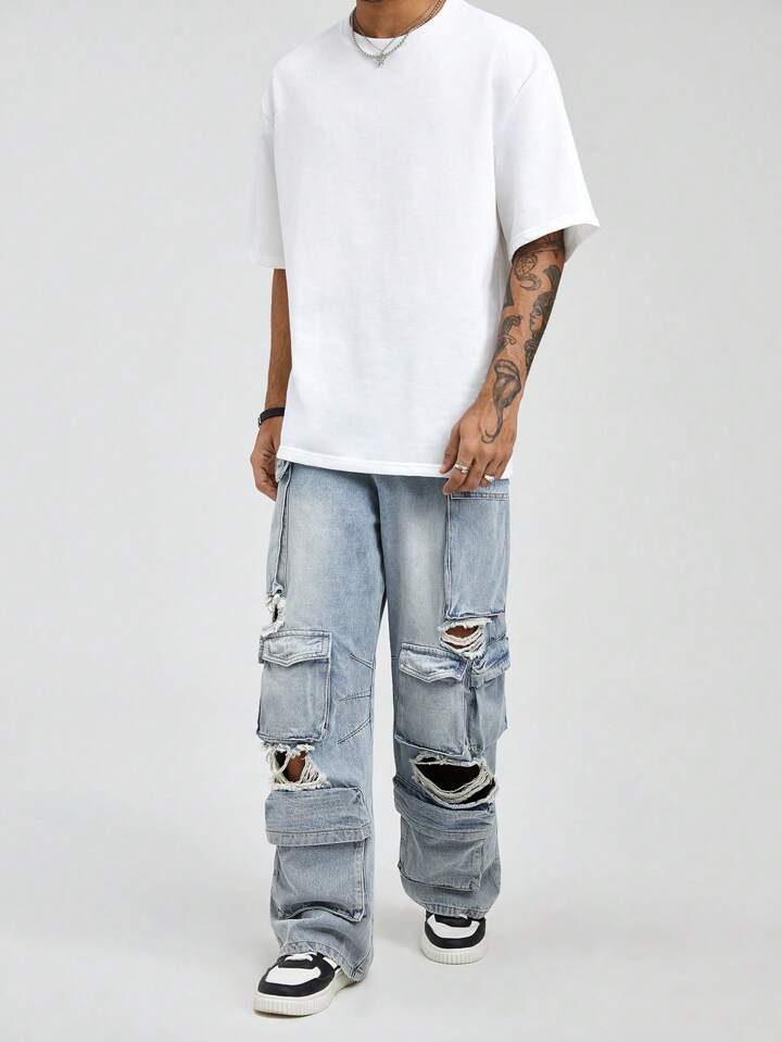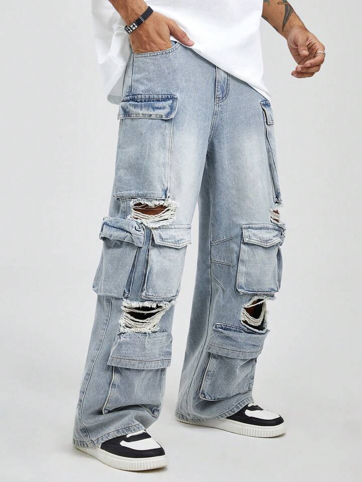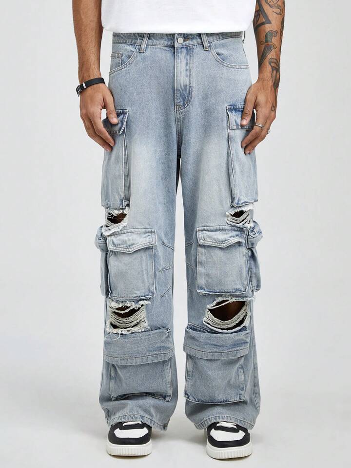 Street Life Jeans in denim consumato con più tasche e bottoni sul davanti, per un uso casual quotidiano da uomo