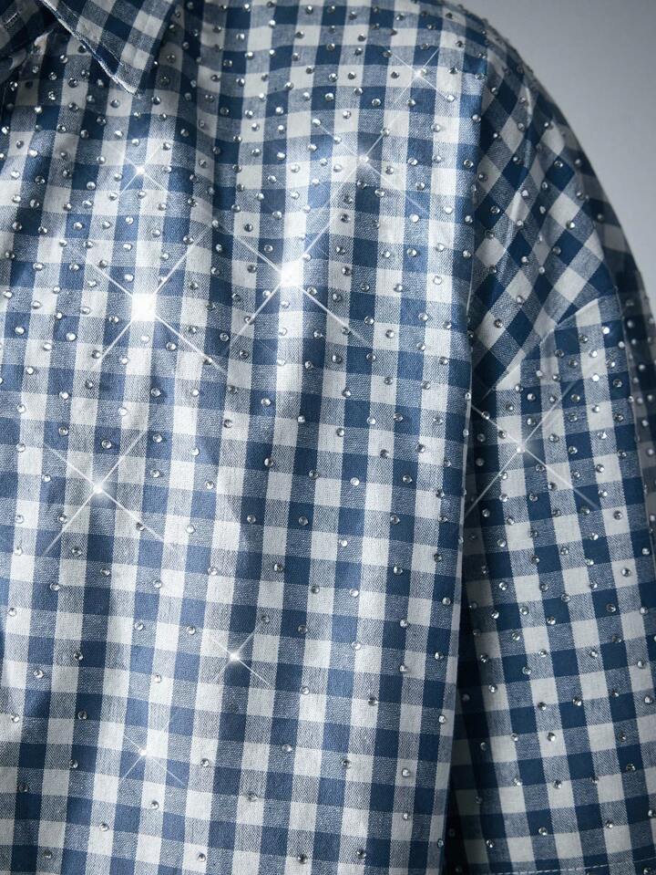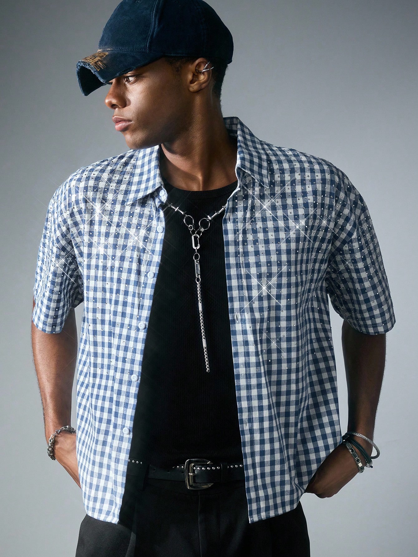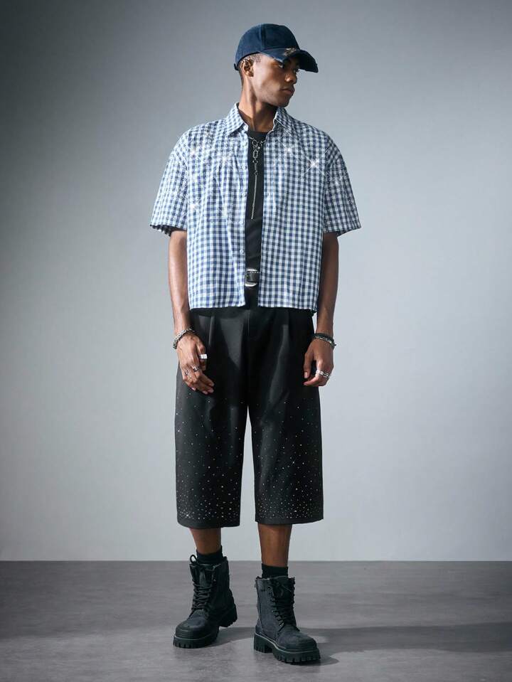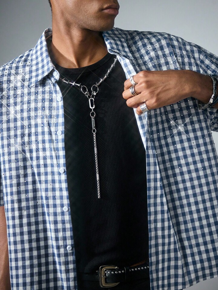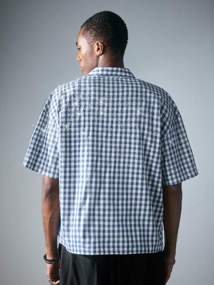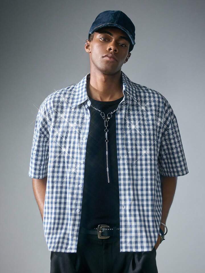 Street Life Camicia a maniche corte a quadri, vestibilità squadrata, con glitter e diamanti, da uomo