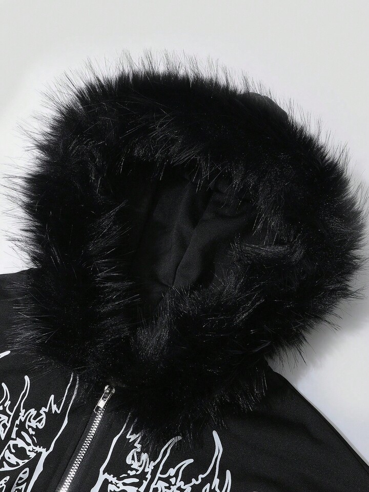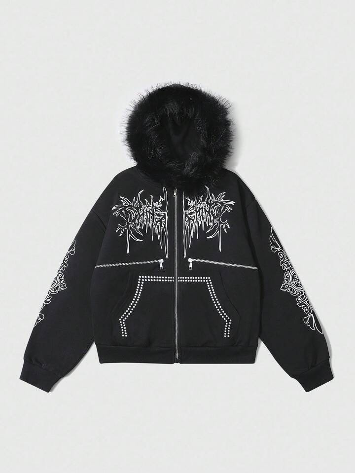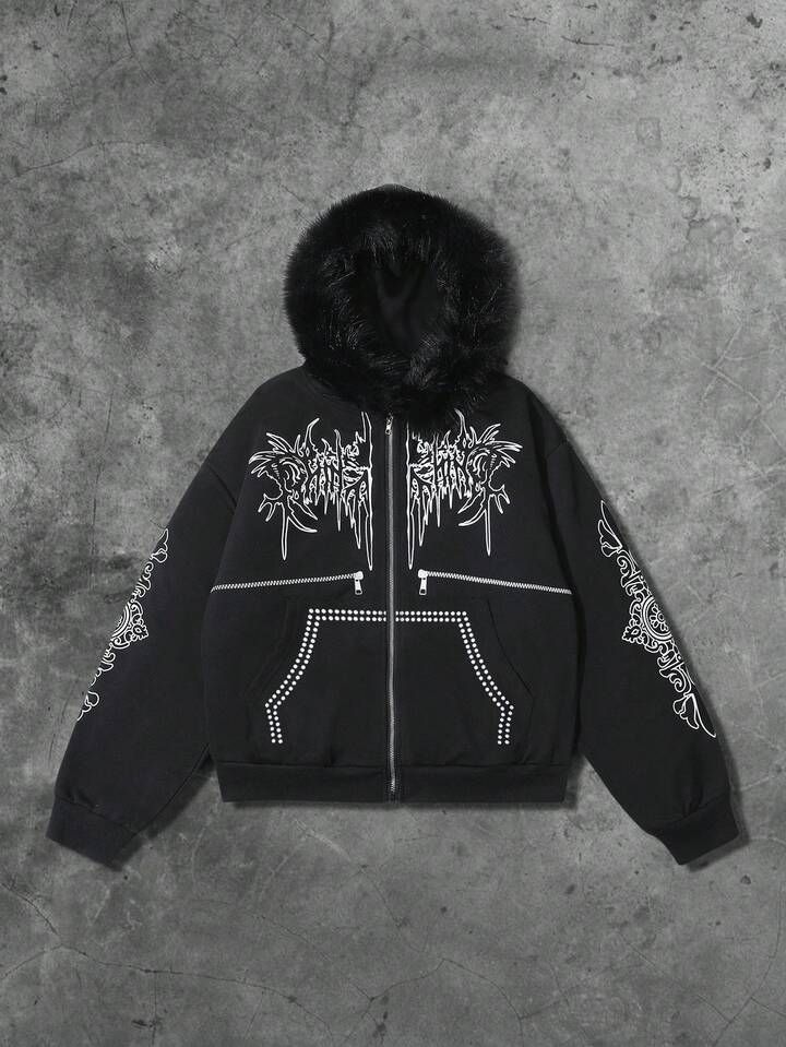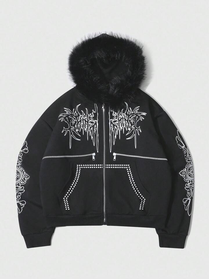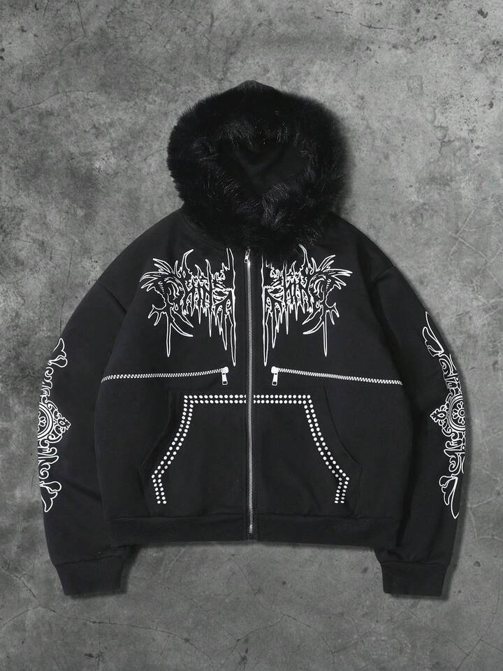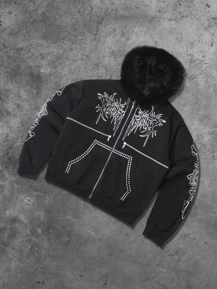 Street Life Felpa con cappuccio da uomo con stampa gotica, chiusura lampo e inserti in eco-pelliccia, adatta per l'autunno/inverno
