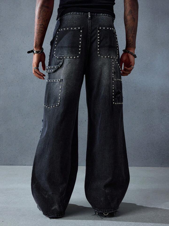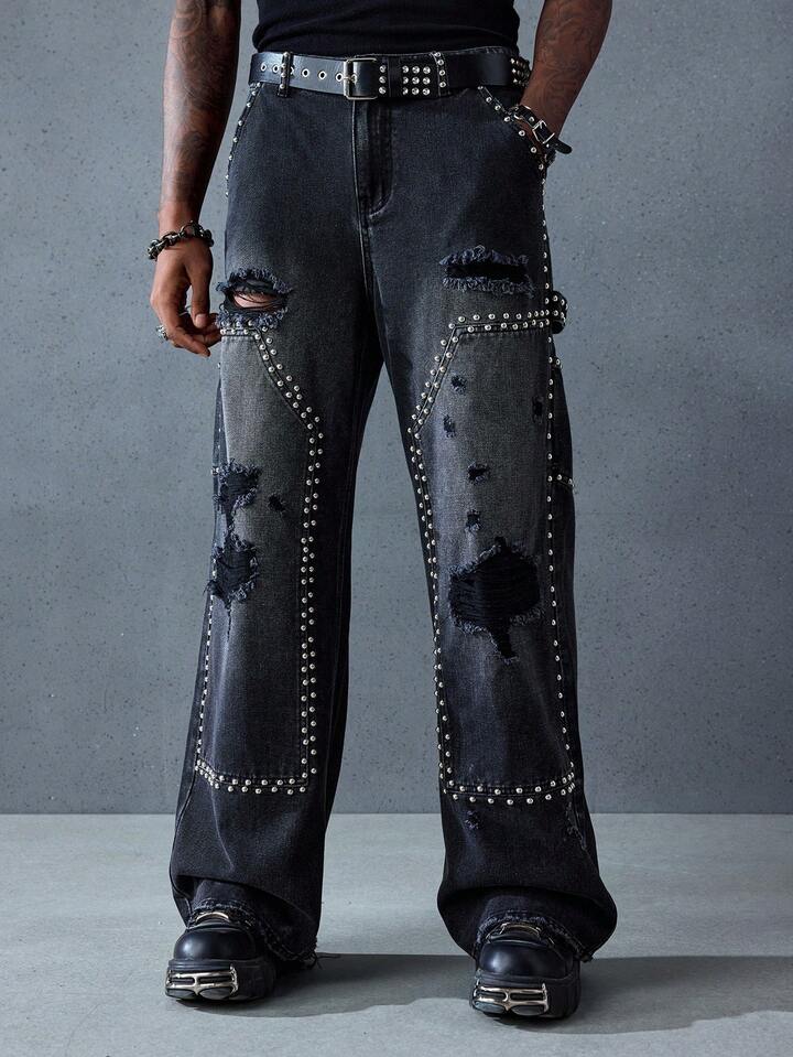 Street Life Jeans in denim pesanti e consumati da uomo, stile punk con borchie
