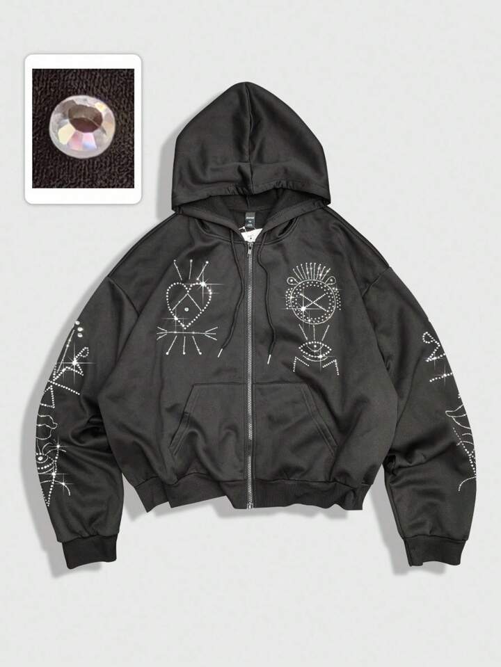 Street Life Felpa casual con cappuccio, chiusura lampo e cordoncino, con decorazioni in strass, per uomo