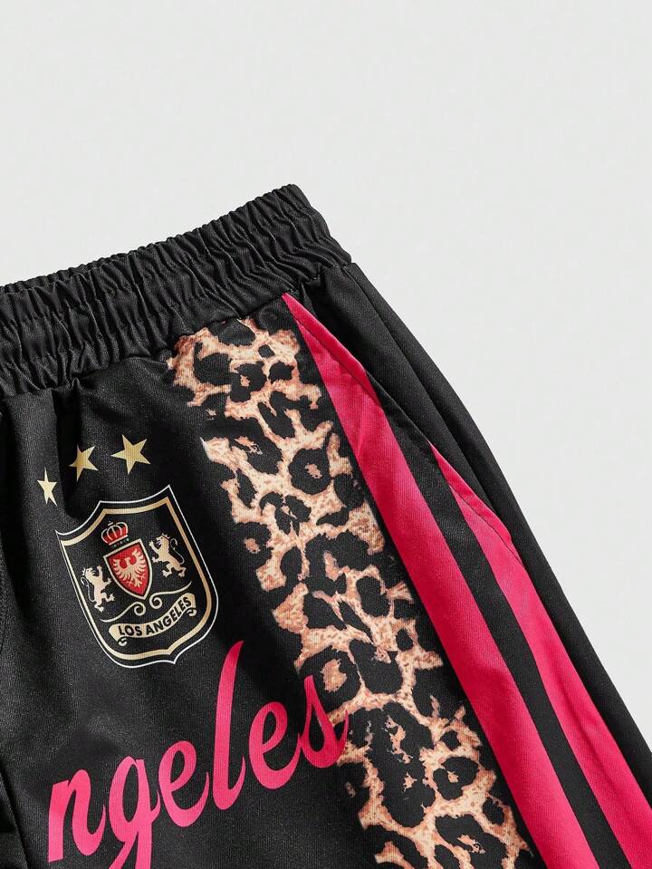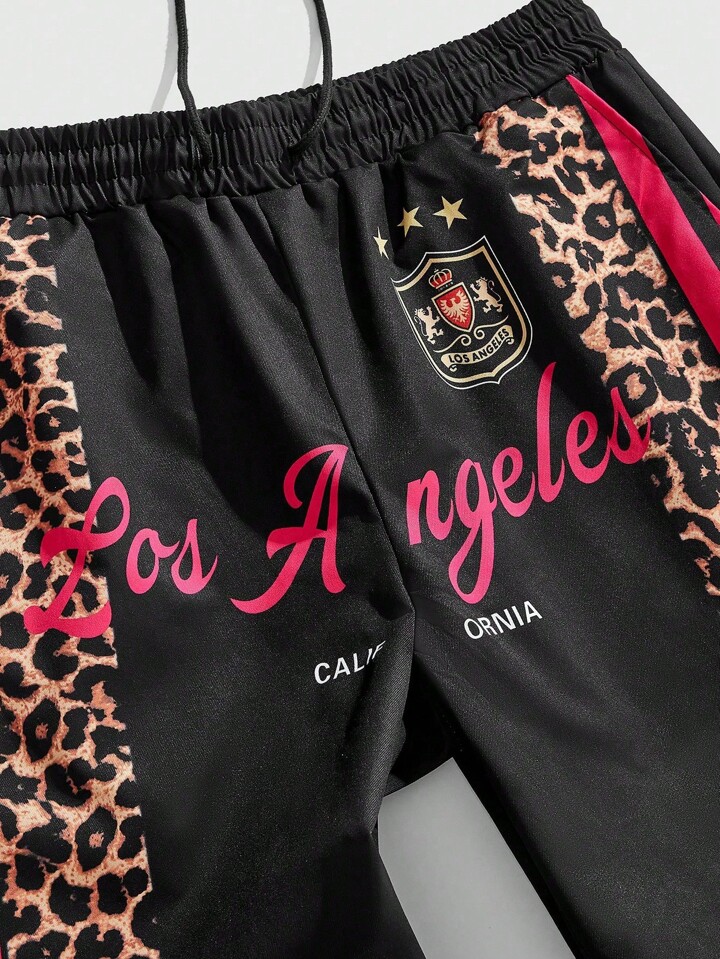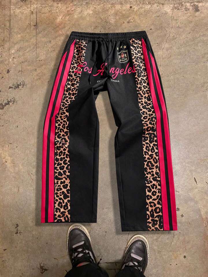 Street Life Pantaloni casual da uomo con stampa leopardata e grafica a lettere, vita con cordoncino