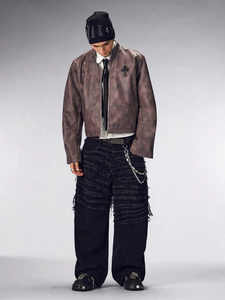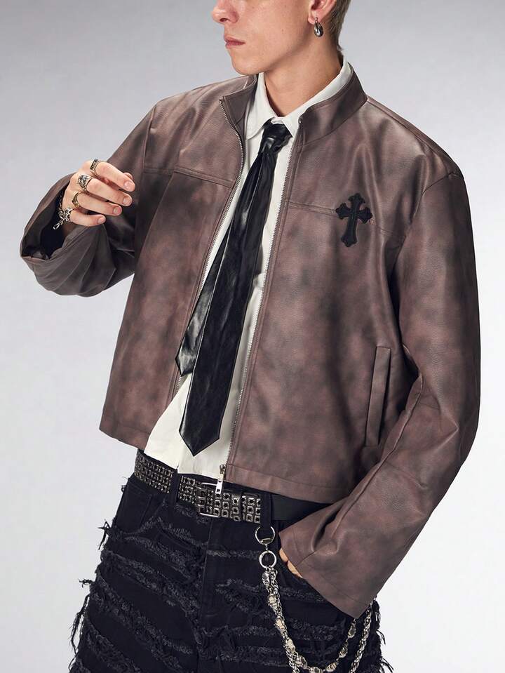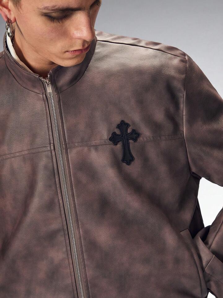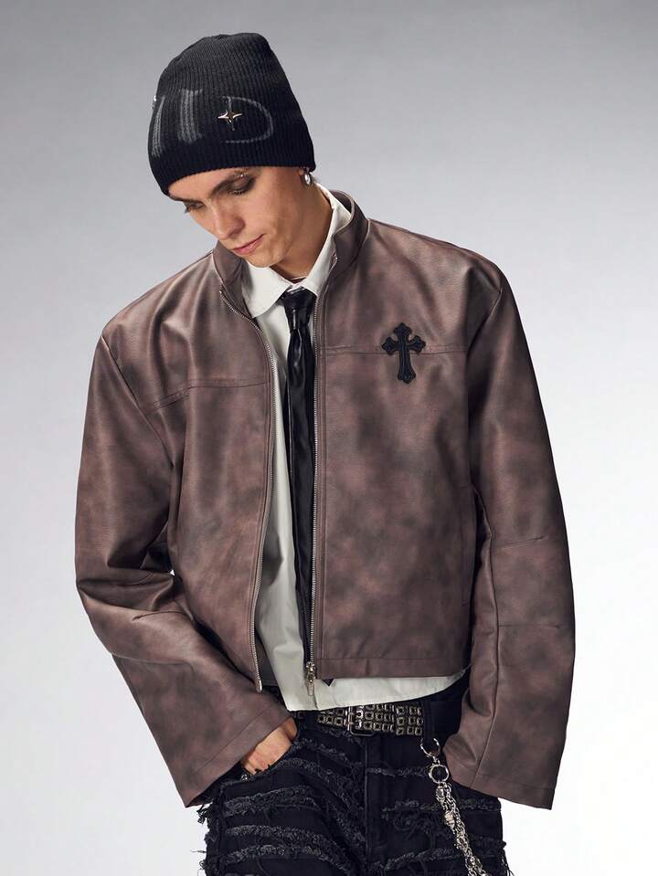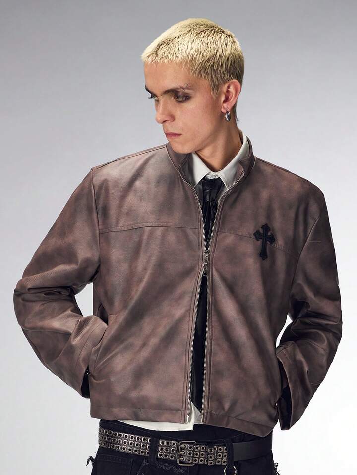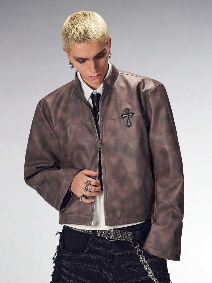 Street Life Giacca in pelle da uomo con chiusura lampo frontale, decorata con grafica a croce, stile punk