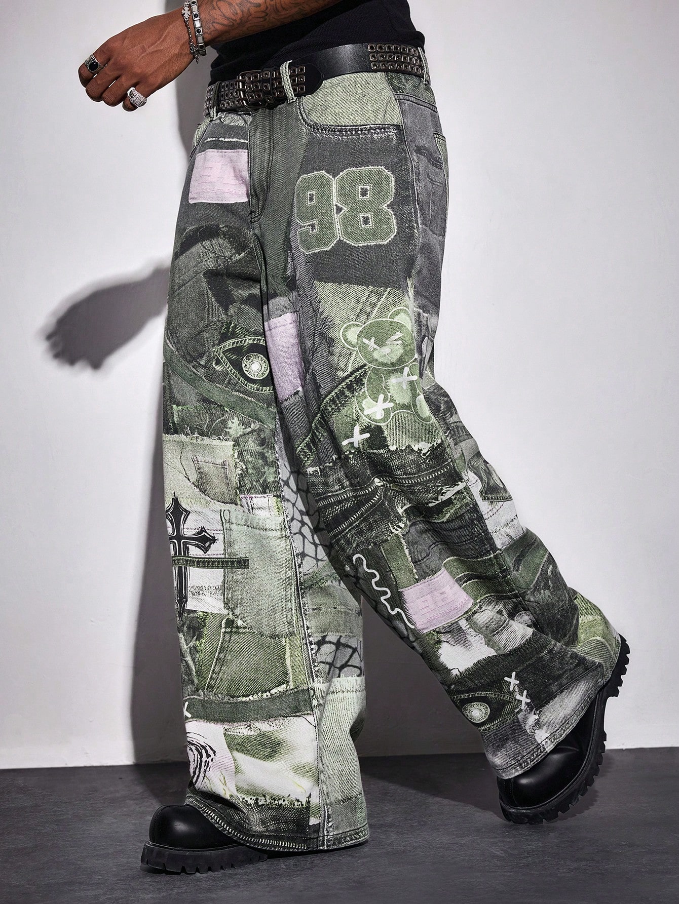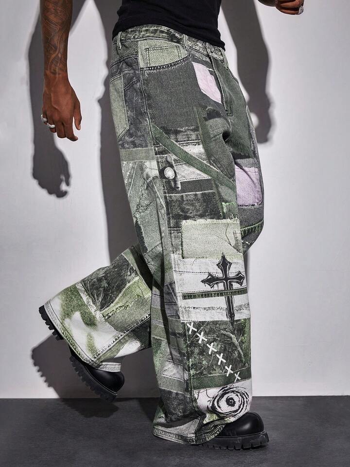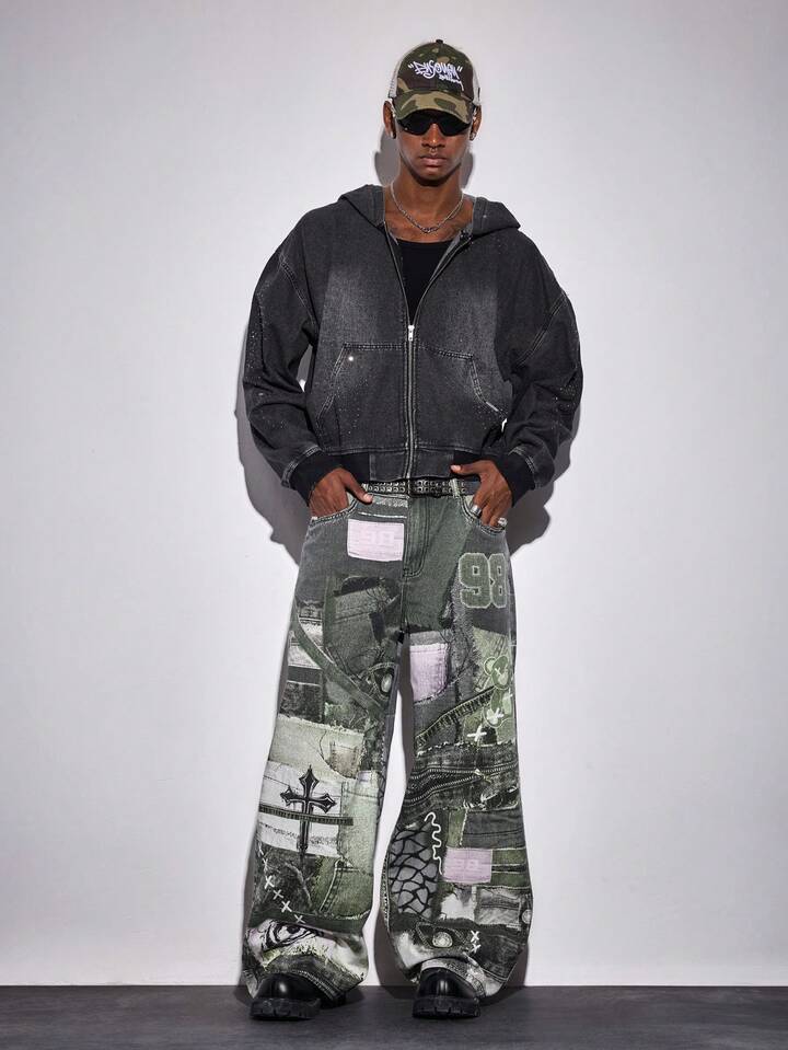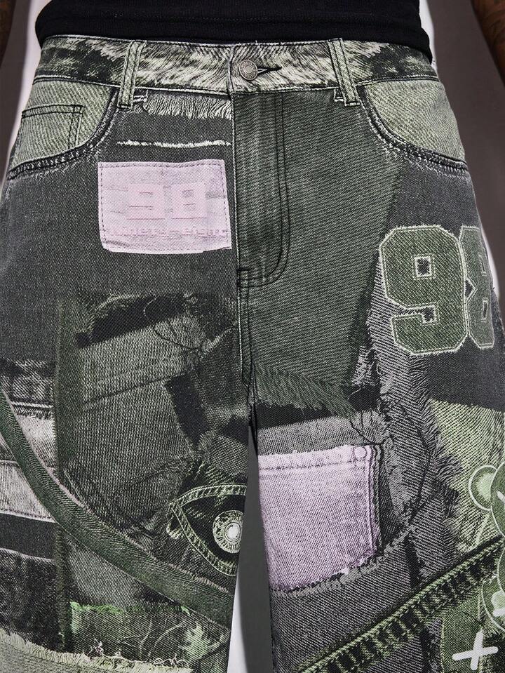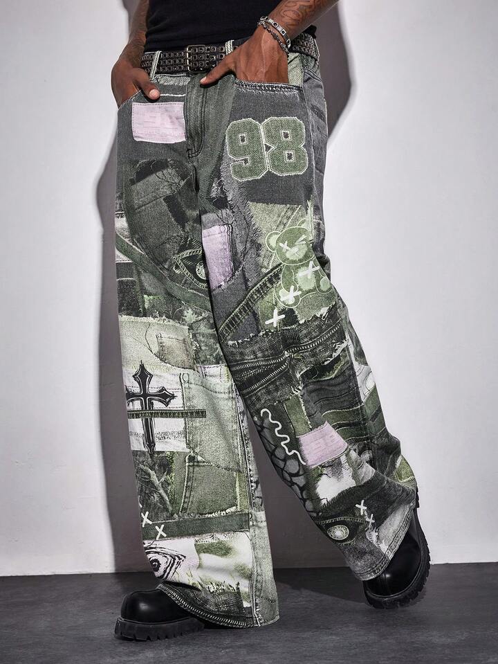 Street Life Jeans casual con gamba ampia, grafica di orso cartoni animati e tasche, vestibilità morbida da uomo