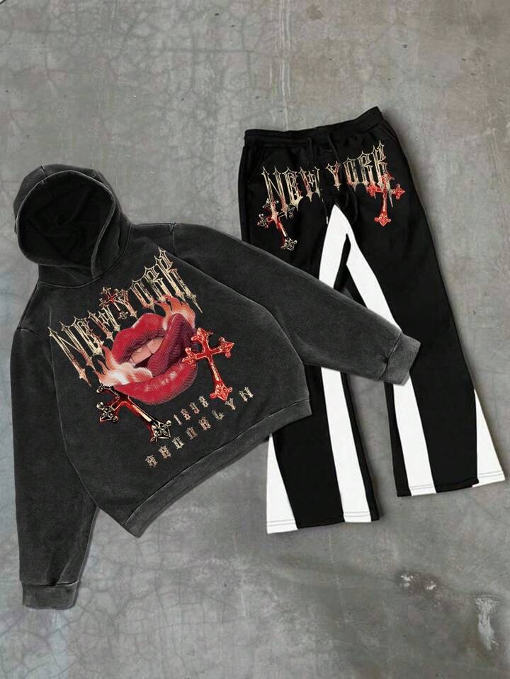 Street Life Set da uomo composto da felpa con cappuccio nera con stampa a lettere a croce sulla bocca e pantaloni della tuta in colore a contrasto