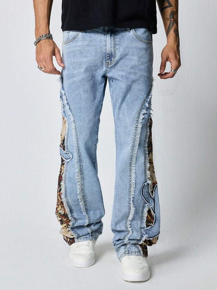 Street Life Jeans da uomo con dettagli slavati, fantasia floreale jacquard e toppework, con tasche