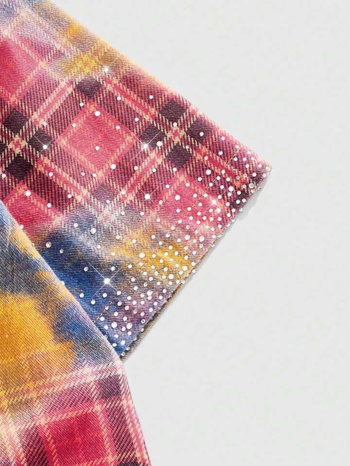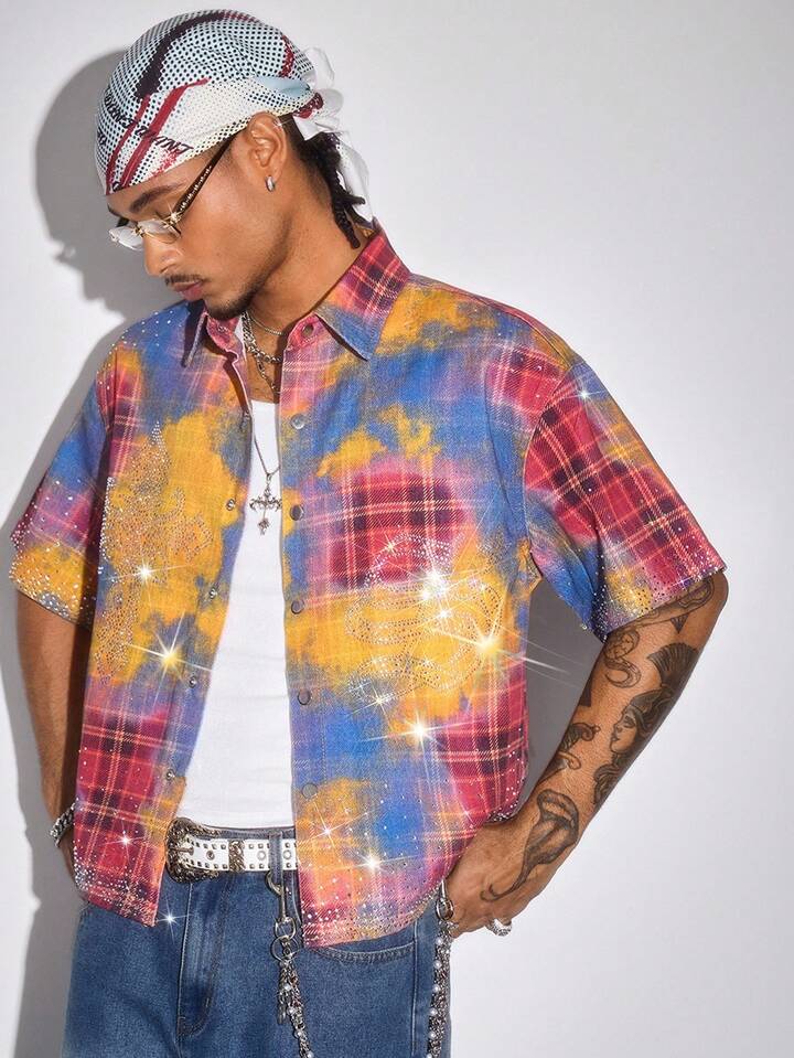 Street Life Camicia di jeans casual monopetto con maniche corte, design a quadri e strass, da uomo