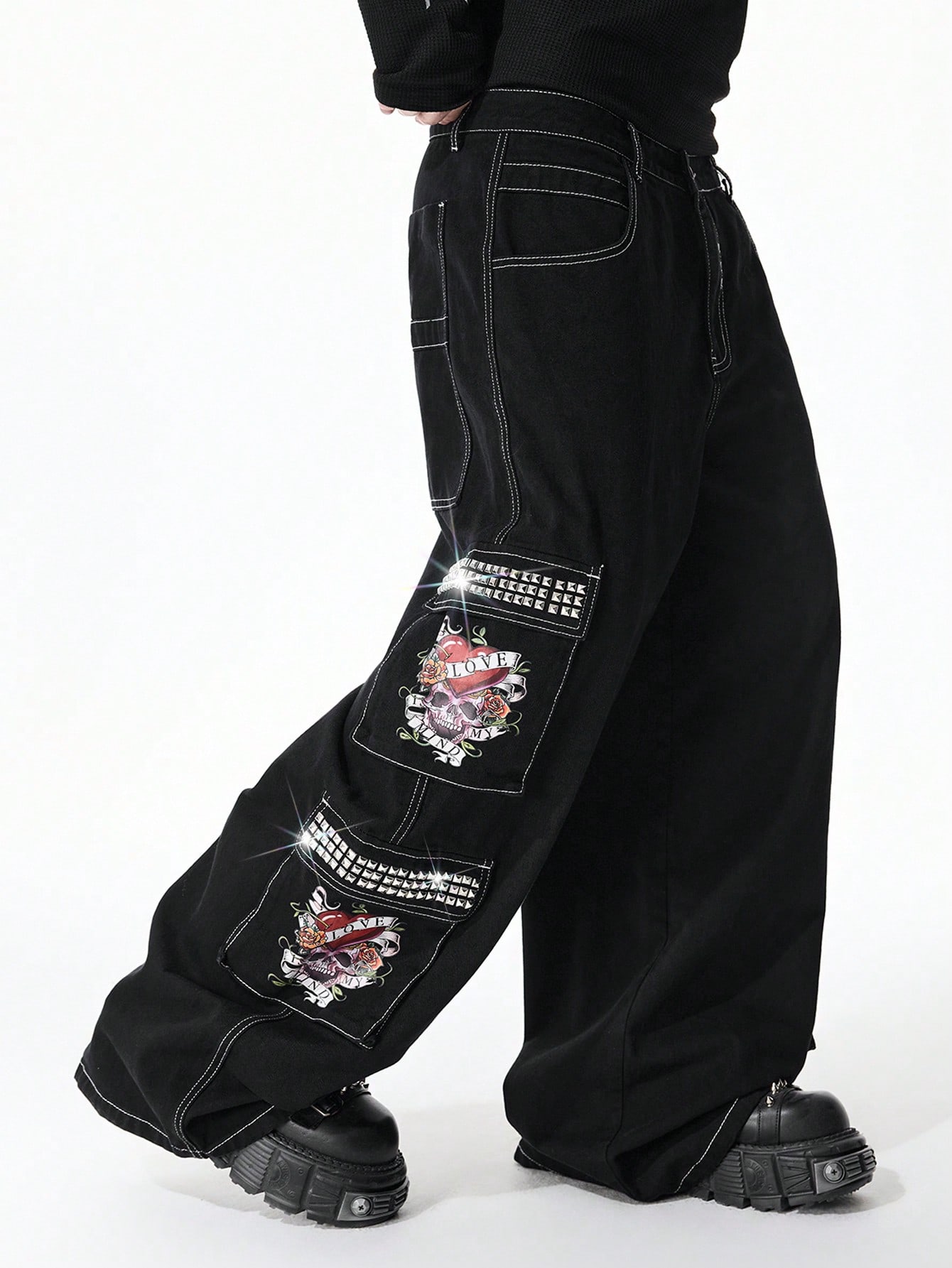 Street Life Jeans casual larghi e morbidi da uomo con grafica a cuore e lettera sulla tasca