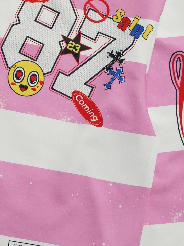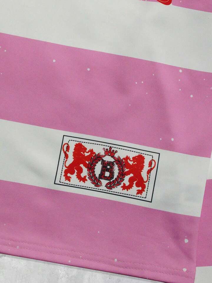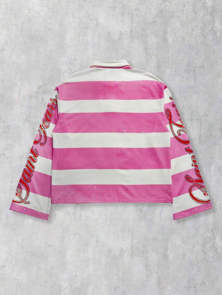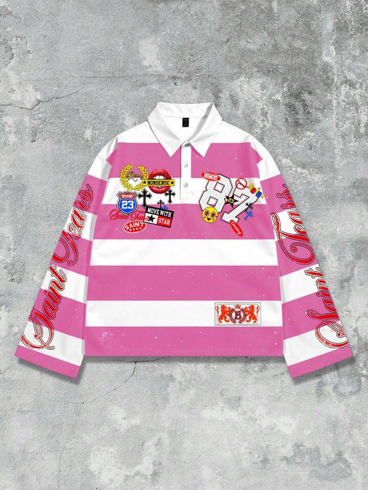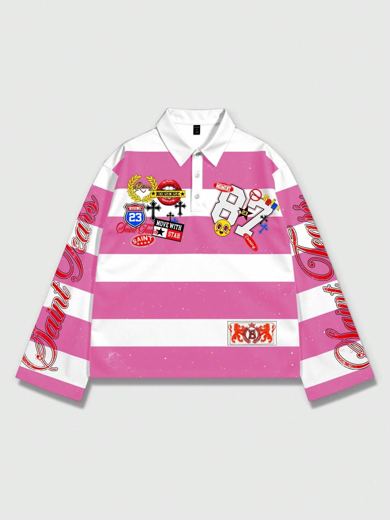 Street Life Maglietta a maniche lunghe con stampa e colletto a polo a righe, stile casual da college per uomo
