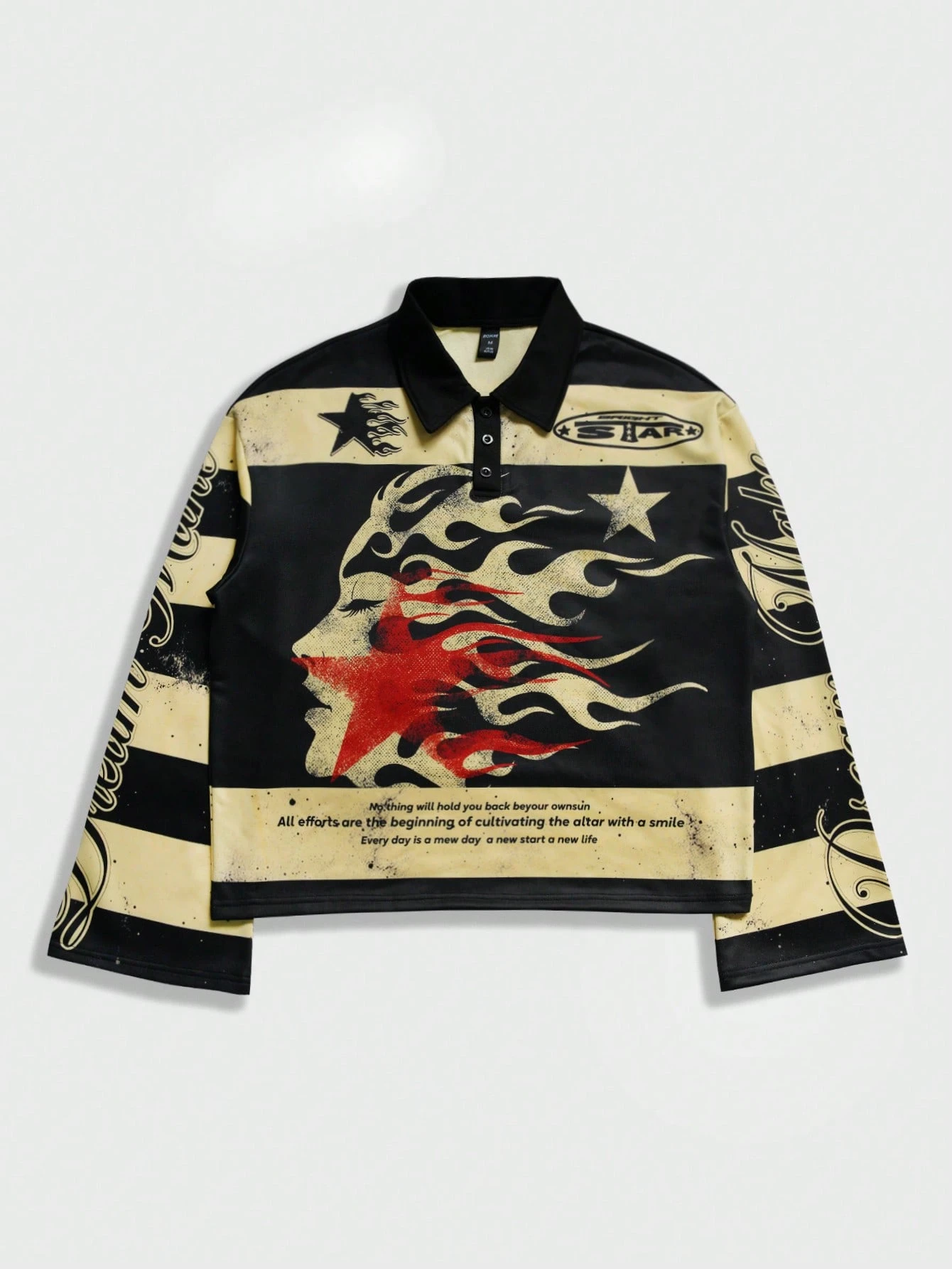 Street Life Maglietta a maniche lunghe con stampa e colletto a polo a righe, stile casual da college per uomo