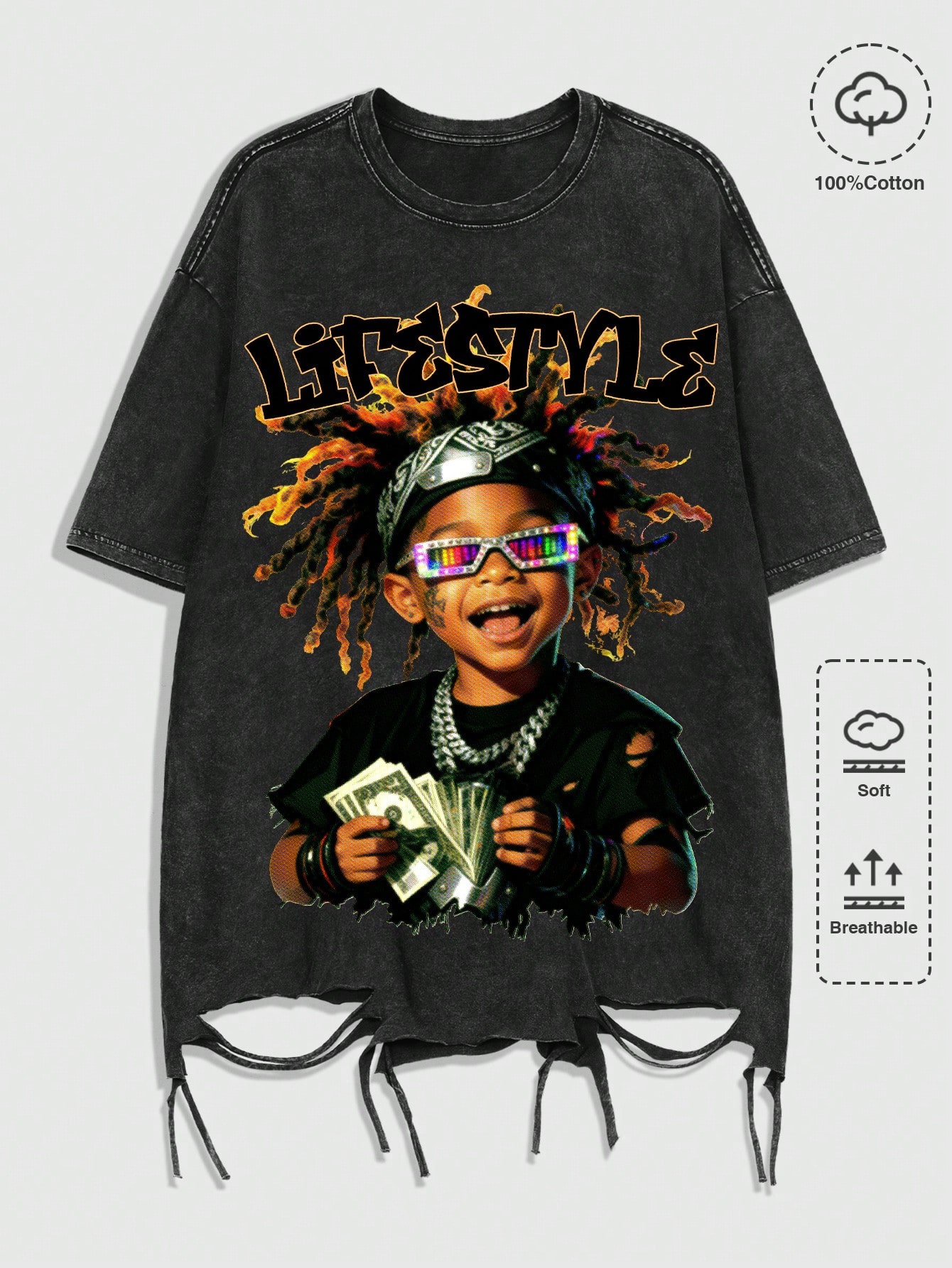 Street Life maglietta casual da uomo a maniche corte con stampa di lettere e numeri, effetto delavato e consumato