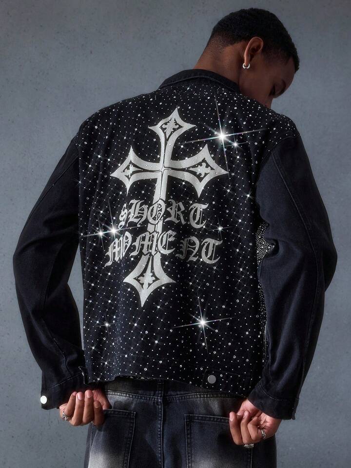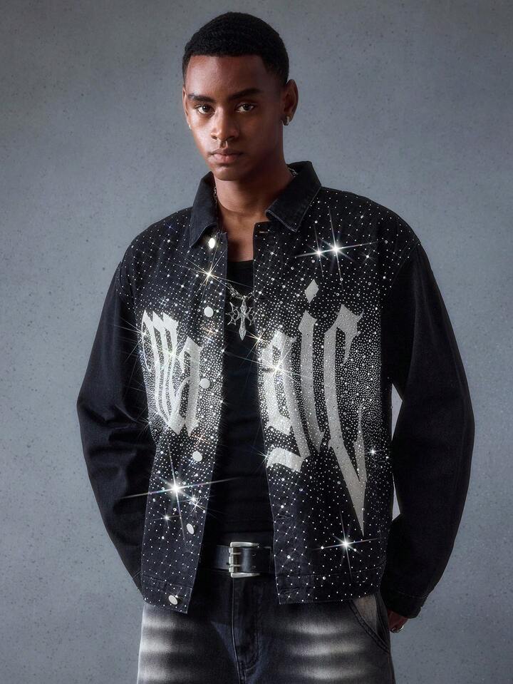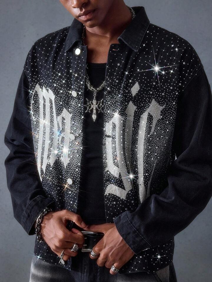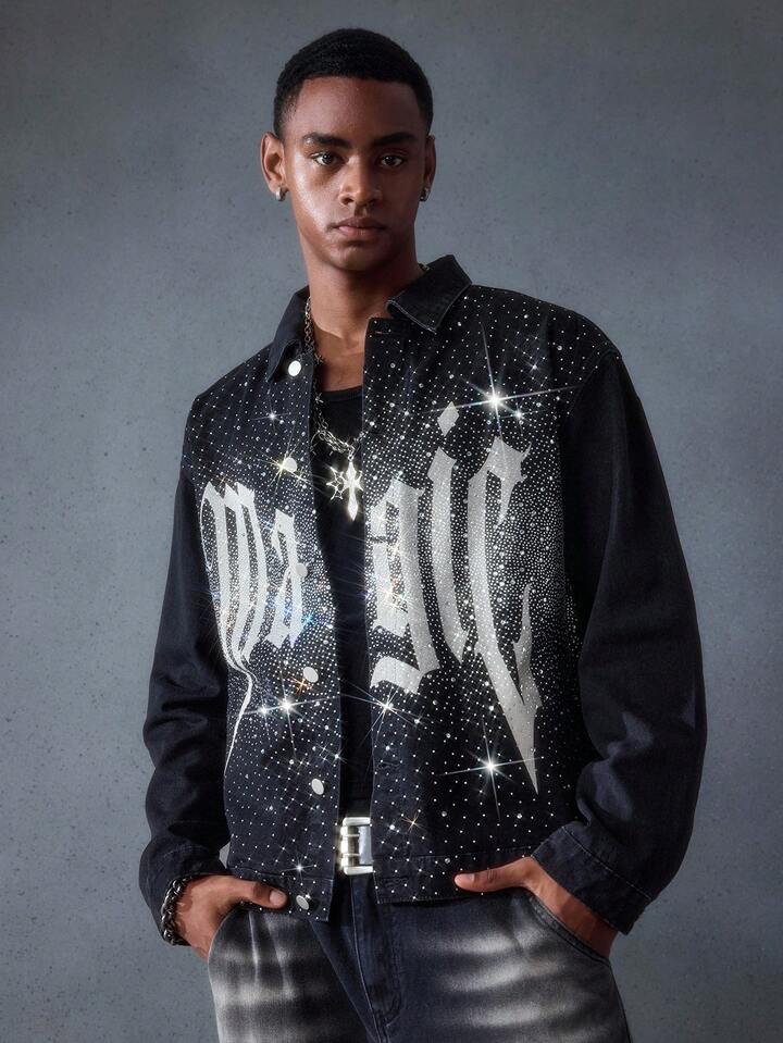 Street Life Giacca di jeans da uomo con maniche lunghe, decorata con strass e stampa
