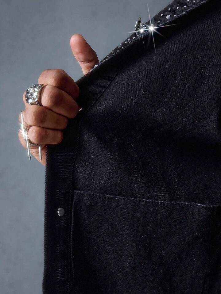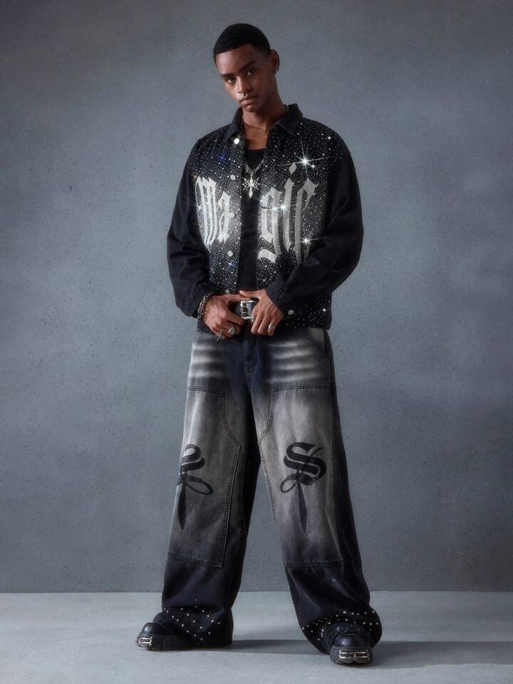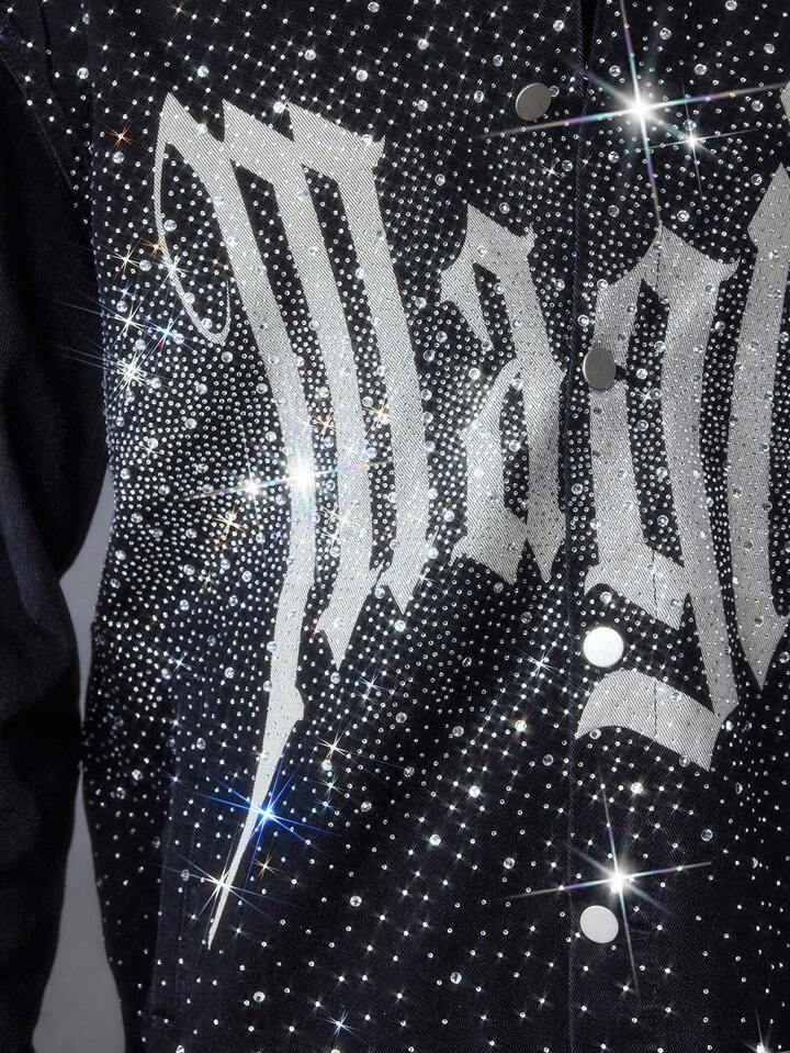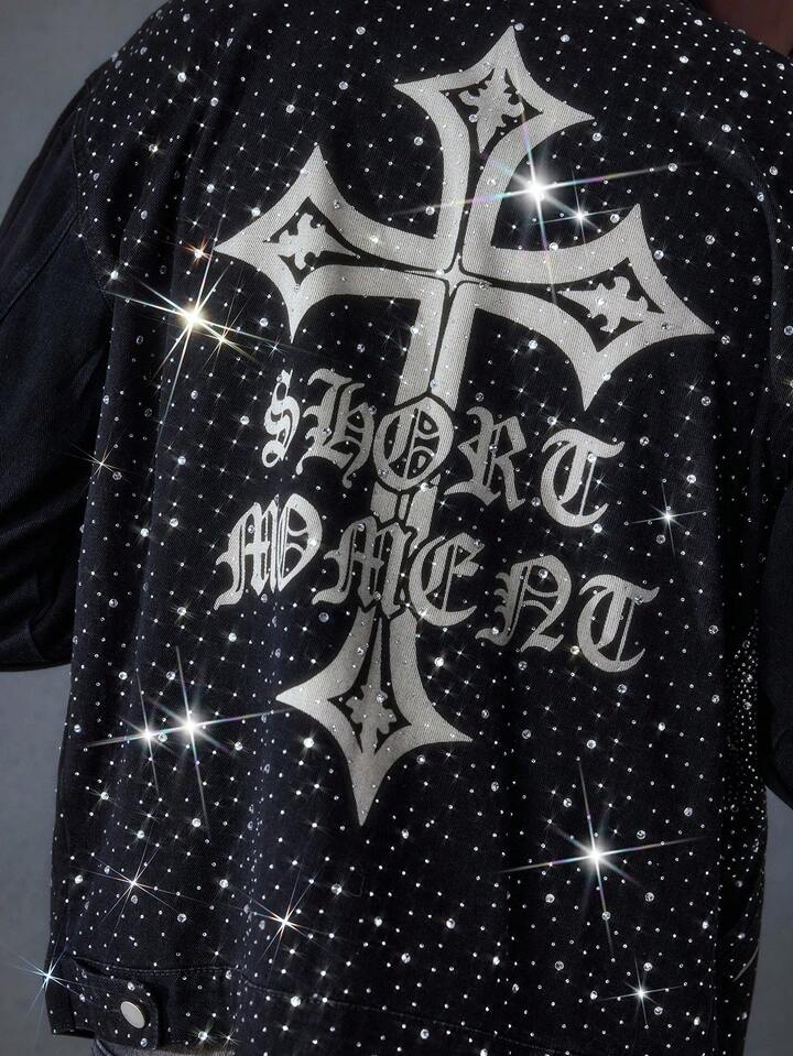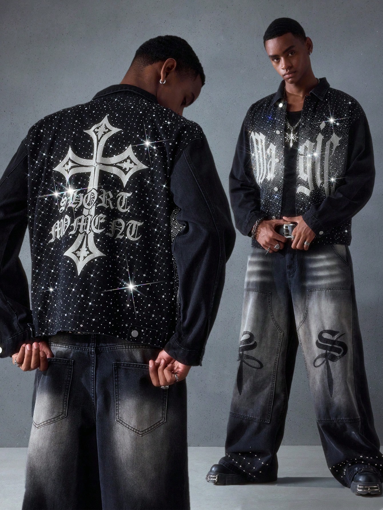 Street Life Giacca di jeans da uomo con maniche lunghe, decorata con strass e stampa