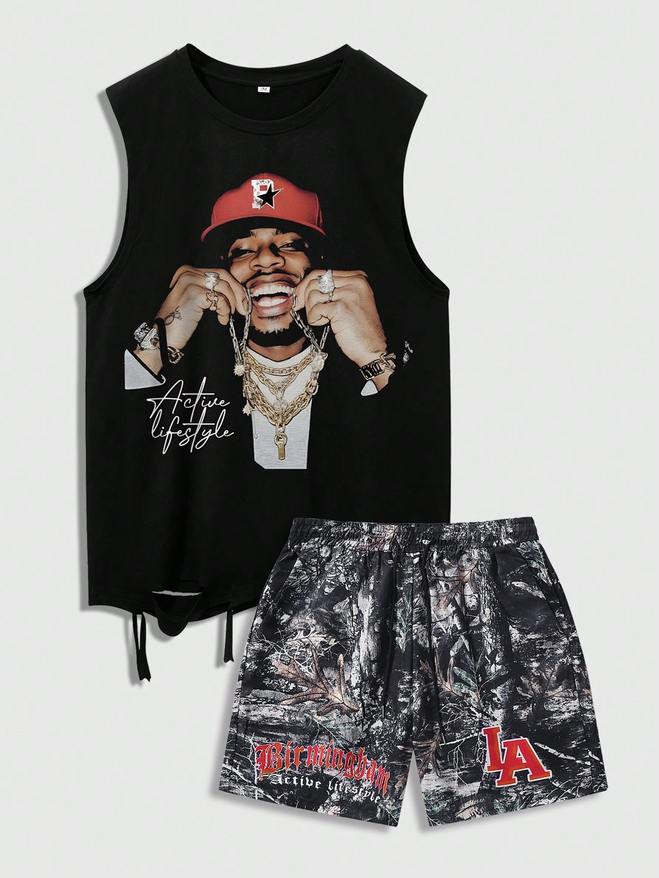 Street Life Set senza maniche da uomo con stile da strada, ritratto americano, maglietta a maniche corte con stampa grafica a catena e ramo e pantaloncini abbinati. La maglietta nera senza maniche presenta una vivida stampa grafica di un uomo sorridente che indossa un cappello rosso e fa un gesto di mano giocoso, con collane e braccialetti d'oro che aggiungono una sensazione casual e rilassata.