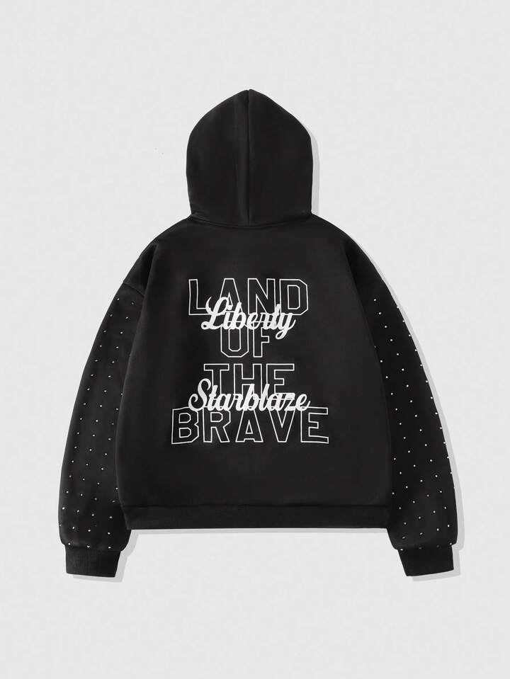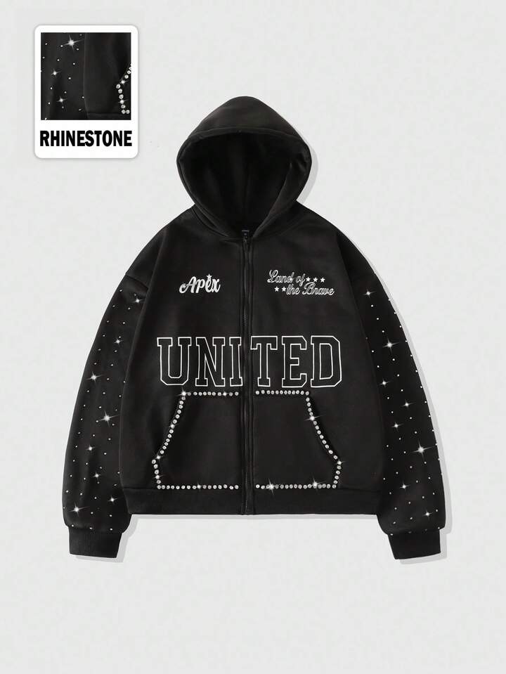 Street Life Felpa con cappuccio da uomo con stampa di lettere scintillanti e diamanti, vestibilità morbida