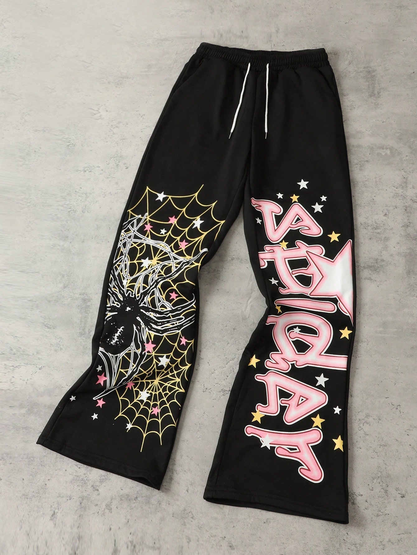 Street Life Pantaloni della tuta da uomo con vita con coulisse e stampa a ragno e lettera, a zampa d'elefante