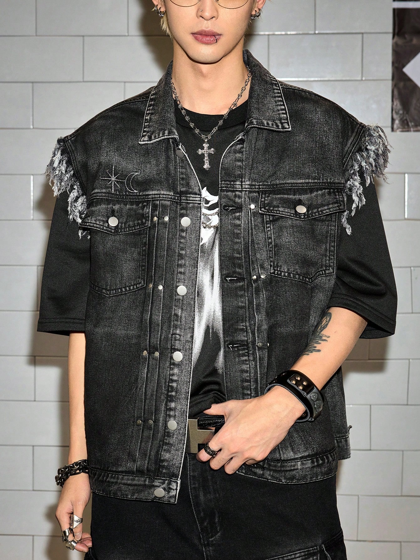 Street Life Gilet di jeans casual da uomo con ricamo di stelle e lune, monopetto, con tasche e orlo sfrangiato