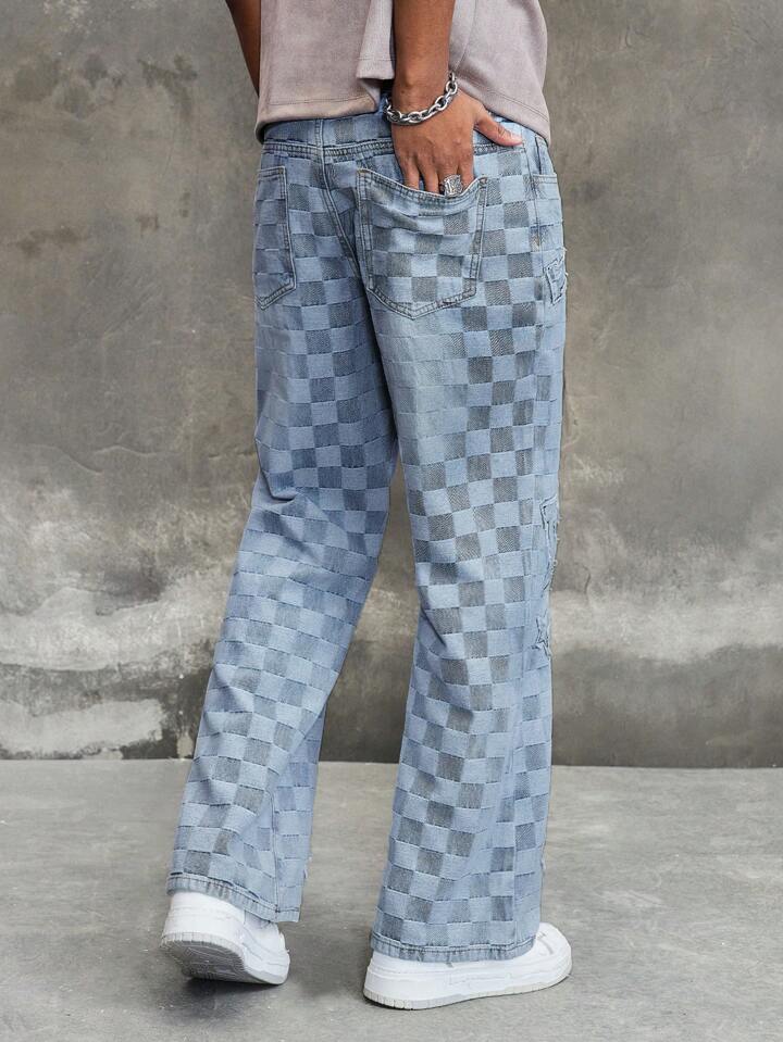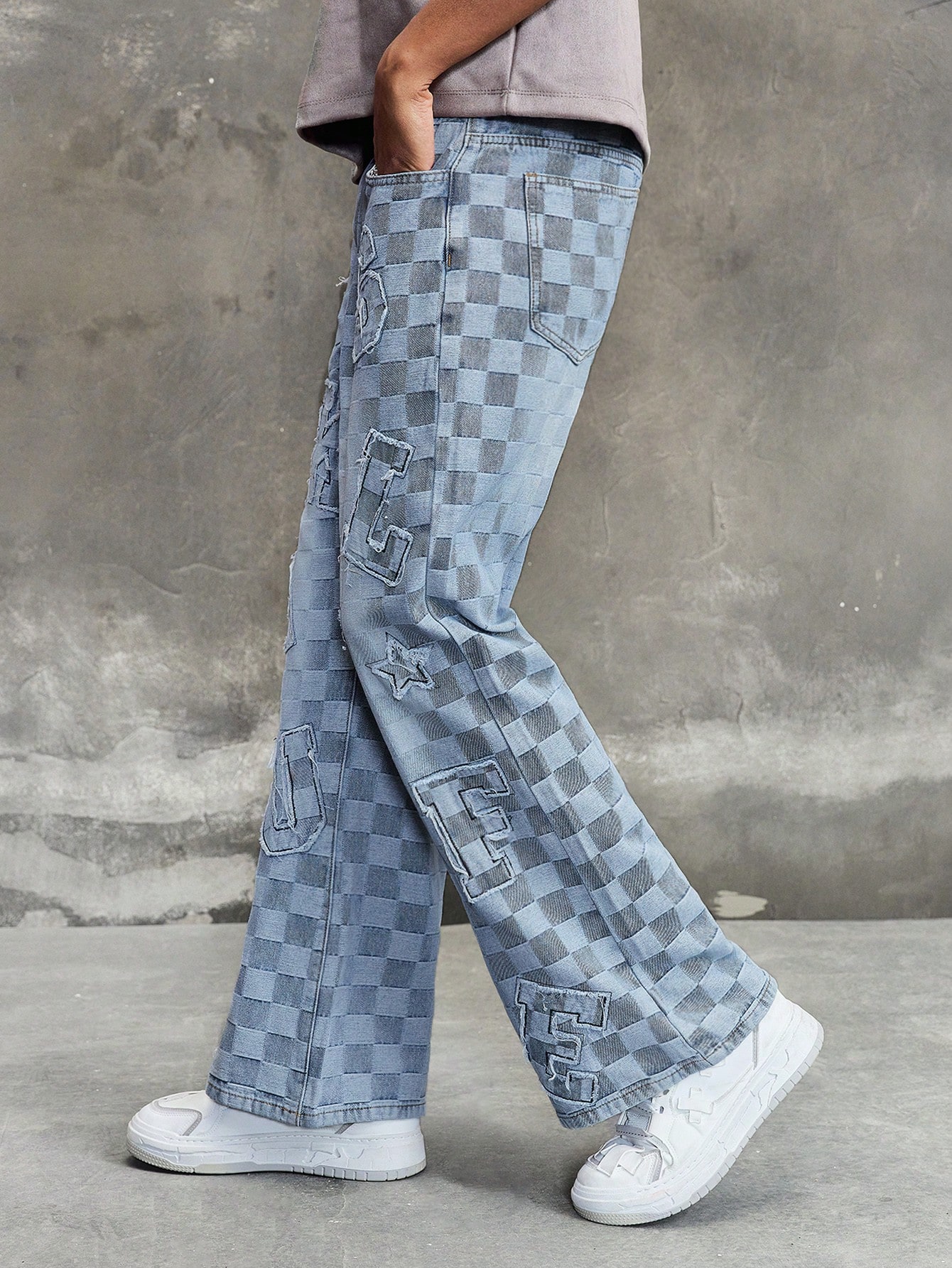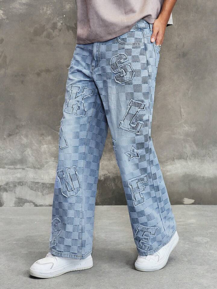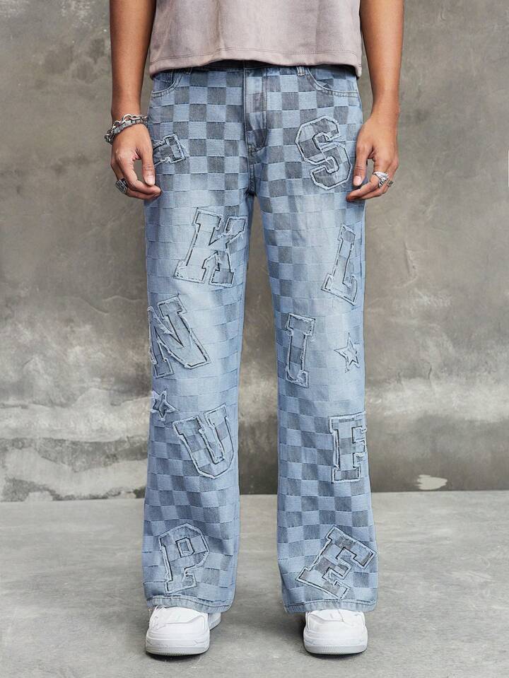 Street Life Jeans a zampa di elefante dritti lavati da uomo con toppe ricamate, pantaloni casual versatili a gamba ampia